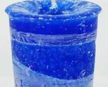 This 2 inches tall, blue, votive candle is scented with clove, nutmeg, lemon balm, poppy seed, cedar, honeysuckle, and juniper. Made in the U.S. by Crystal Journey Candles.