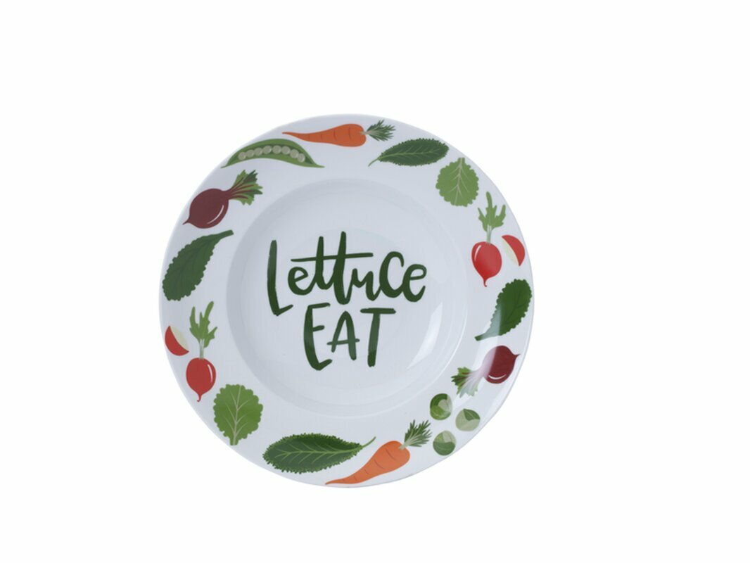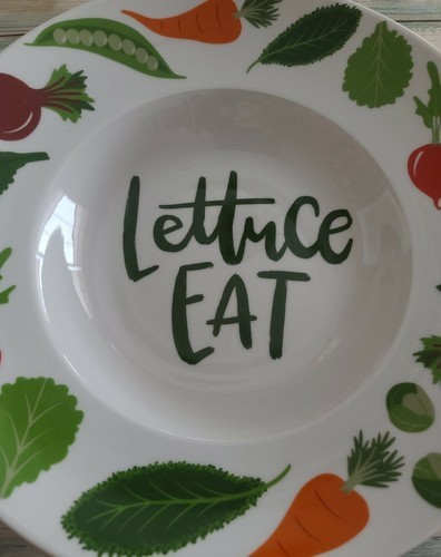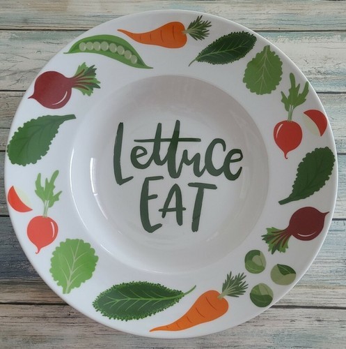 Quirky ~ vegetable pun ~ "Lettuce Eat" in the bottom ~ center of the bowl