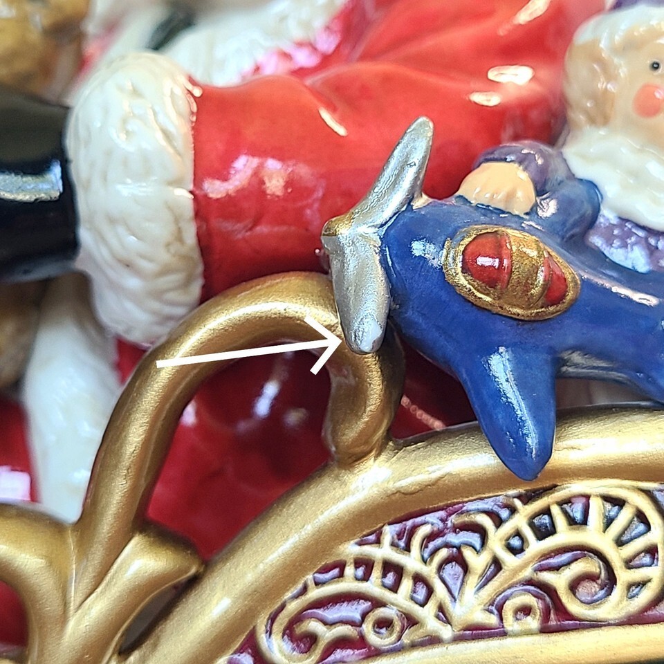 CONDITION: Very good pre-owned condition. There is some minor cosmetic damage to a few areas of the item. All flaws are photographed. The tiny metal piece under Santa's sleigh is missing. This is what holds the lantern. I'm sure this can be very easily repaired. Includes the original box and protective styrofoam inserts. Please review all photos for condition. Item is sold as-is and priced accordingly. ITEM WILL BE SHIPPED IN ORIGINAL BOX AND PACKAGING!