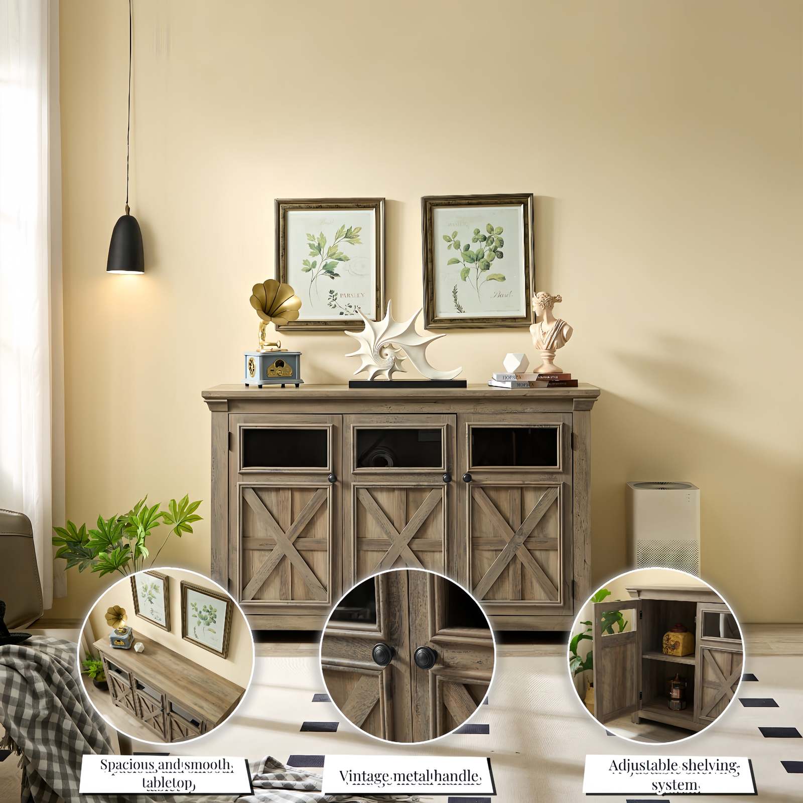 Elegant and spacious, the 3 Doors Cabinet Large Buffet Sideboard is a sophisticated addition to any home. This Bar Wine Cabinet is perfect for an Entryway or Living Room, offering ample storage space in a stylish Gray Wash finish. Whether used as a Buffet Cabinet Table, Coffee Bar, or Wine Bar, this piece adds both functionality and elegance to any space. Ideal for the Dining Room, it provides large storage space for all your dining essentials while adding a touch of luxury to your home decor.