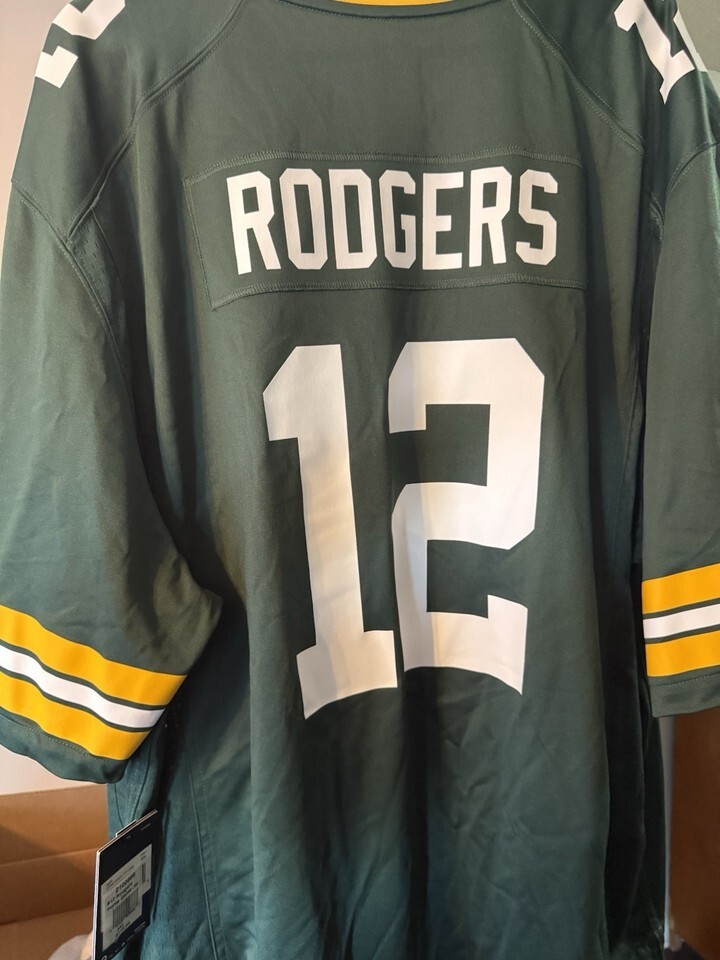 Show your support for the Green Bay Packers with this Nike NFL On Field Jersey featuring Aaron Rodgers. This jersey is perfect for any football fan, especially those who love the Packers. It is made of high-quality materials and has a comfortable fit, making it perfect for wearing to games or as a part of your everyday wardrobe. The jersey is sized 3XL and is designed for men. The green color and the iconic Packers logo make this jersey a must-have for any true fan. Get yours now and show your love for the team!