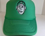 Bold and quirky trucker hat in bright green featuring an embroidered monkey face with headphones and an X-eye detail. Foam front with rope accent, breathable mesh back, and adjustable snap for fit. Inside tag reads NISSIN CAP (Made in China), a maker commonly used for custom/promo hats. Pre-owned with light wear; crown holds shape well and mesh is intact. Great statement piece for festivals, streetwear, or collectors of oddball graphics.