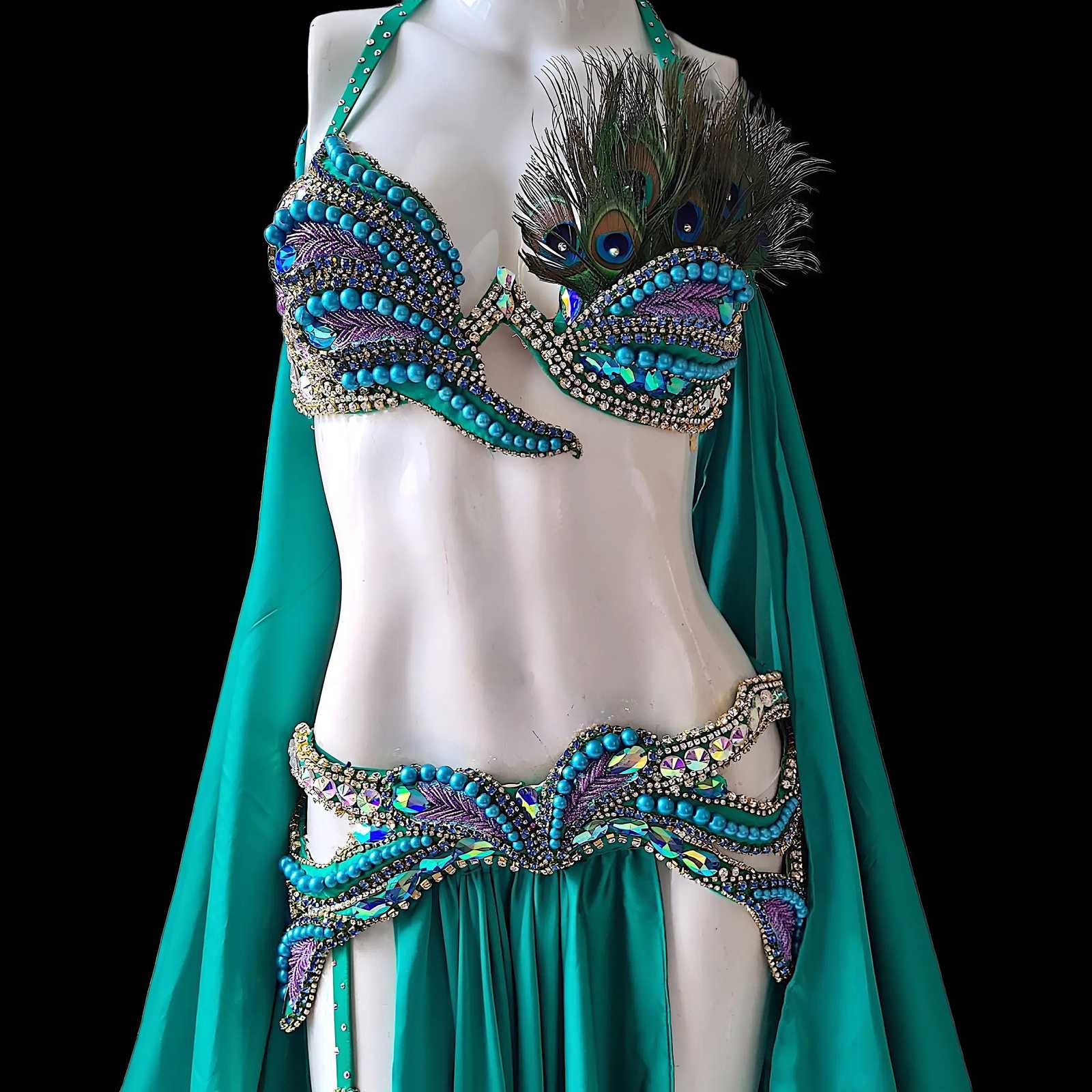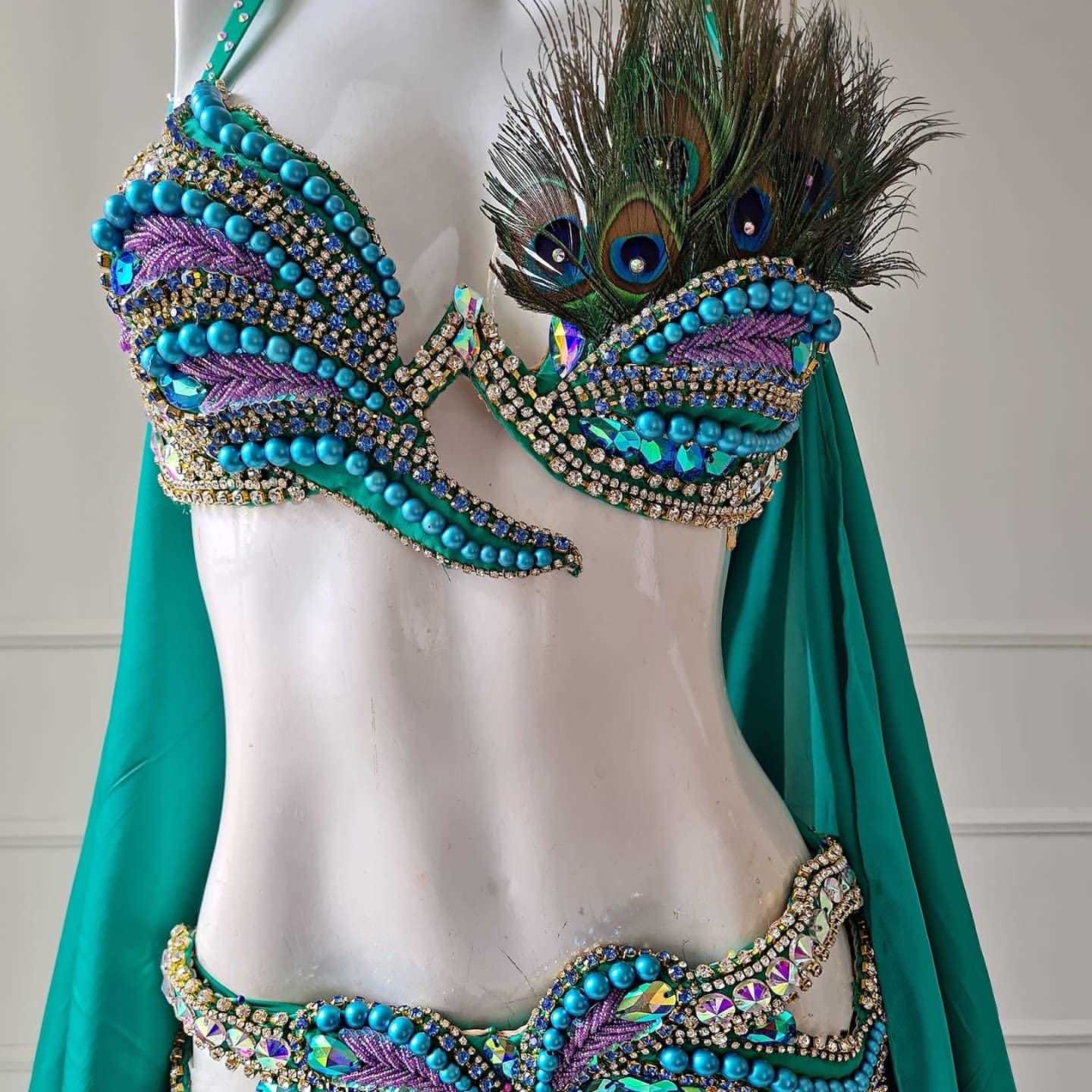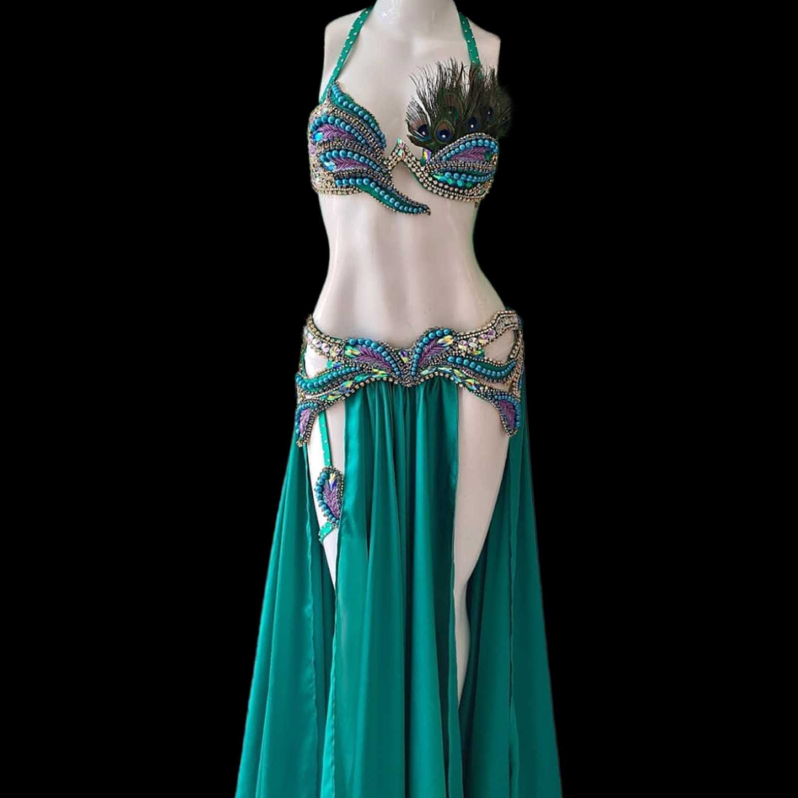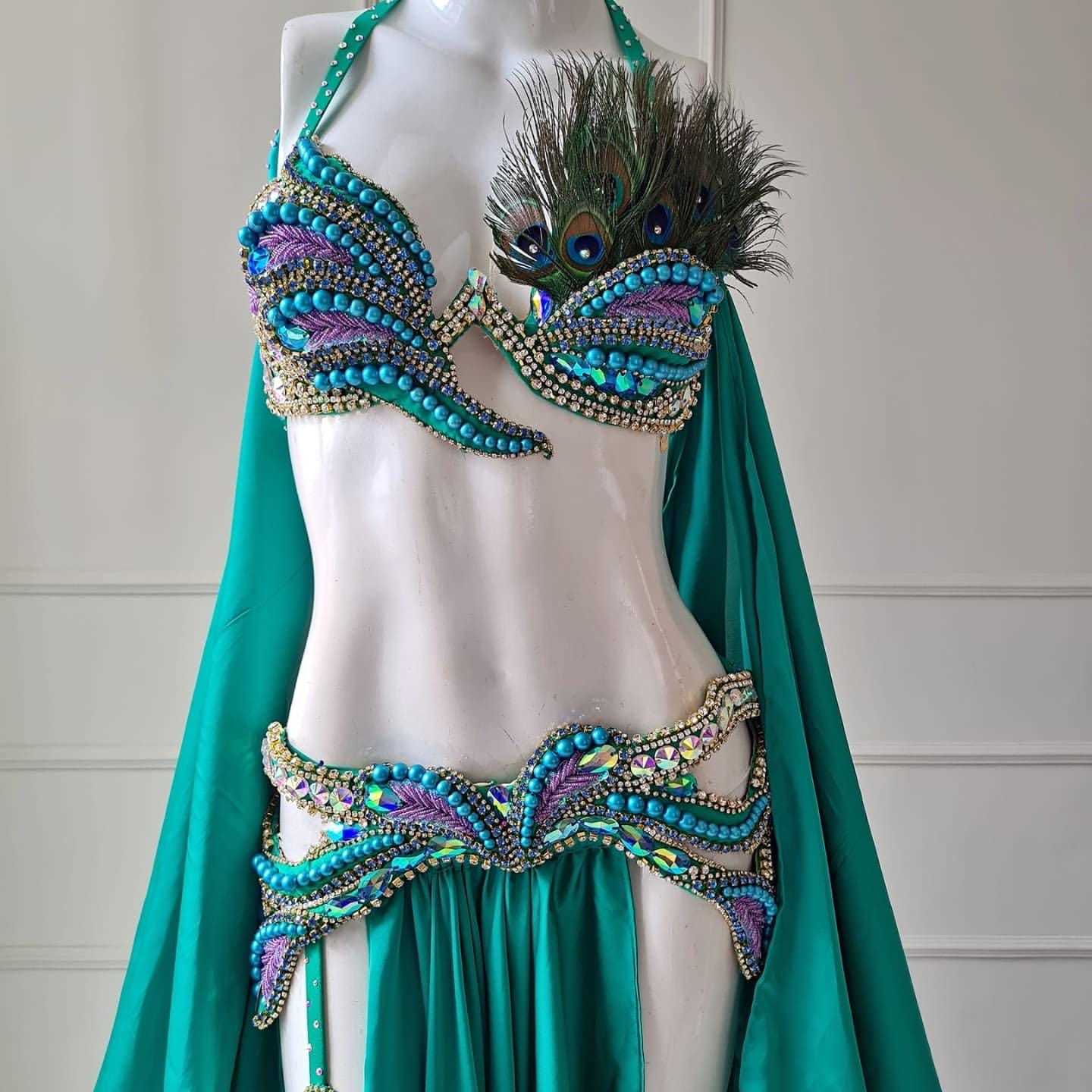 - Green Peacock Belly Dance Costume: Handmade Crystal Showgirl Dress
