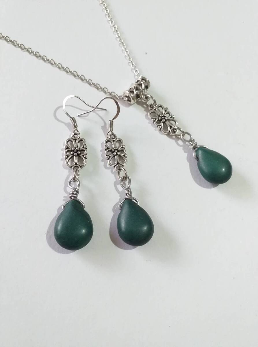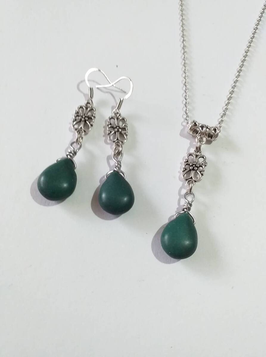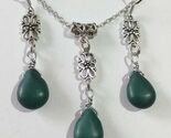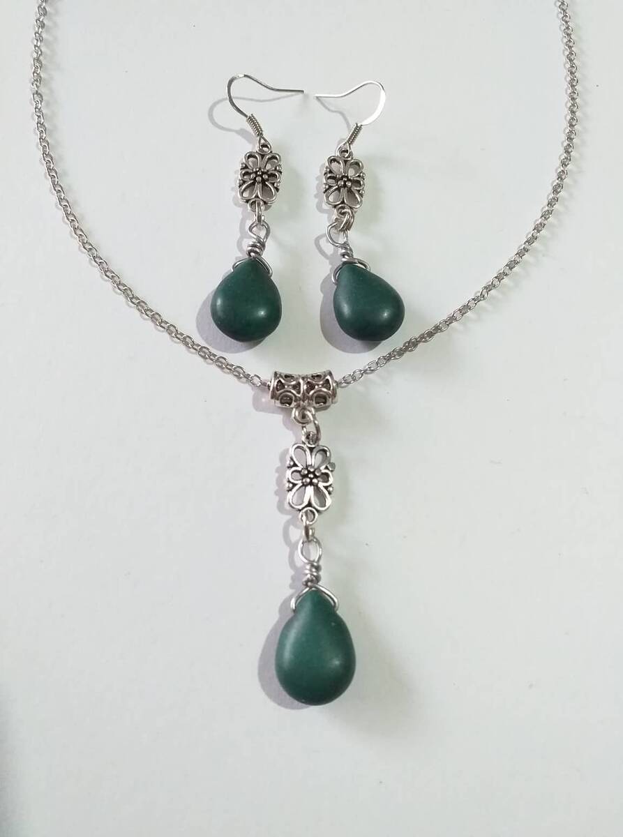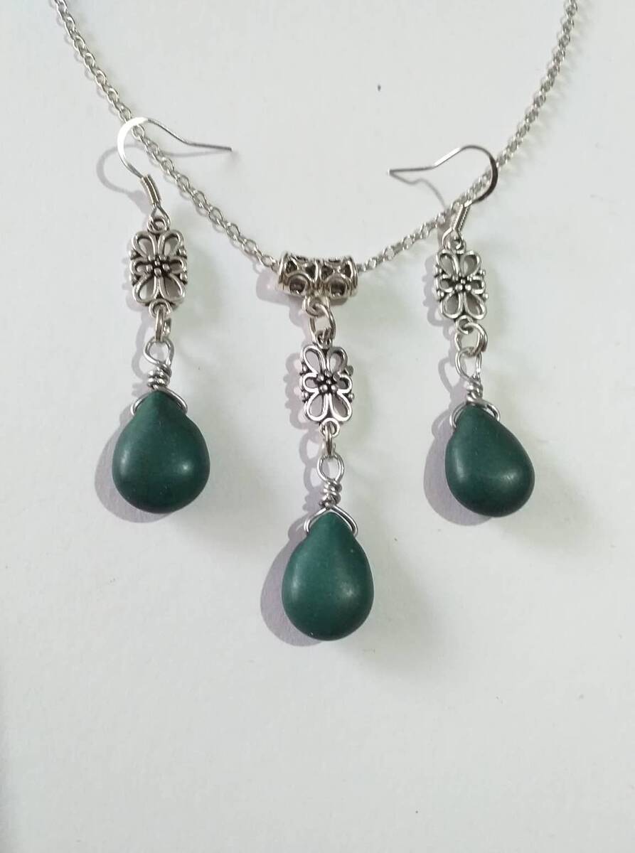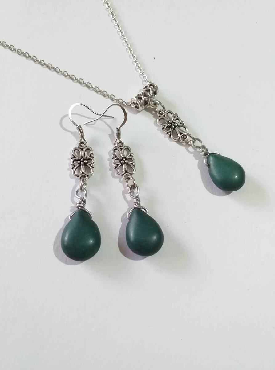 Beautiful Set of silver-tone Antique style ornaments and Teardrop shaped dark green Turquoise necklace and earrings . Silver-tone Turquoise pendant Victorian style necklace and earrings . Boho necklace . Bohemian necklace and earrings . Romantic necklace and earrings . Beautiful necklace with same style earrings with Turquoise. Gift jewelry set.