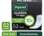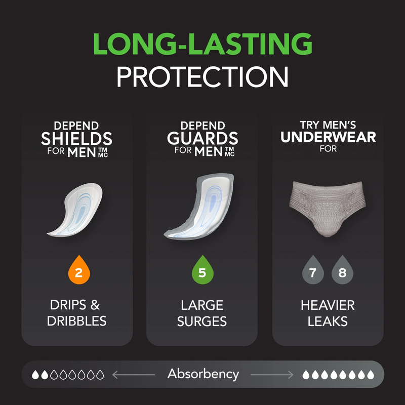 DEPEND GUARDS: 52 count of Depend Incontinence Guards for Men, maximum absorbency FOR LARGE BLADDER LEAKS: Depend men?s bladder leakage pads feature a super absorbent core which absorbs 30x its weight* to help protect against large bladder leaks or surges (*super absorbent material absorbs 30x its weight) ODOR CONTROL: Our bladder leak pads are made with OdorBlock technology DESIGNED FOR MEN: Each guard is one-size-fits all and features a cup-like shape to fit a man?s body while Comfort-Flex leak barriers offer protection SECURE FIT: These men?s incontinence pads for larger bladder leaks come with a strong adhesive to help hold in place in briefs or boxer briefs DISCREET: Depend Guards are discreetly worn in your underwear For light bladder leaks, use Depend Shields for Men Depend incontinence pads for men are HSA/FSA-eligible in the US (check with your provider for coverage details)