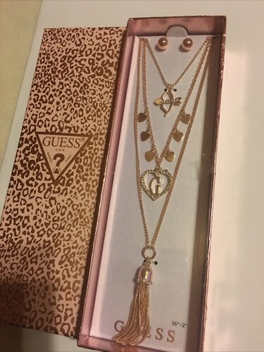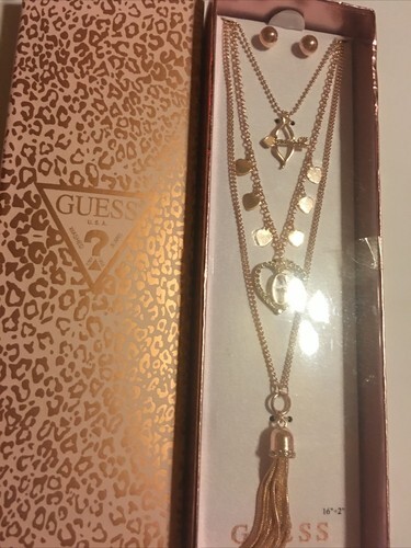 - Guess Crystal Three Layered Heart TASSEL Charm Necklace Earrings Set new in Box