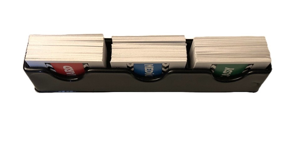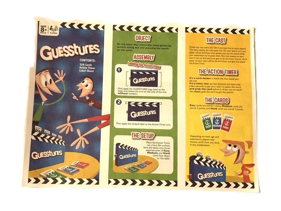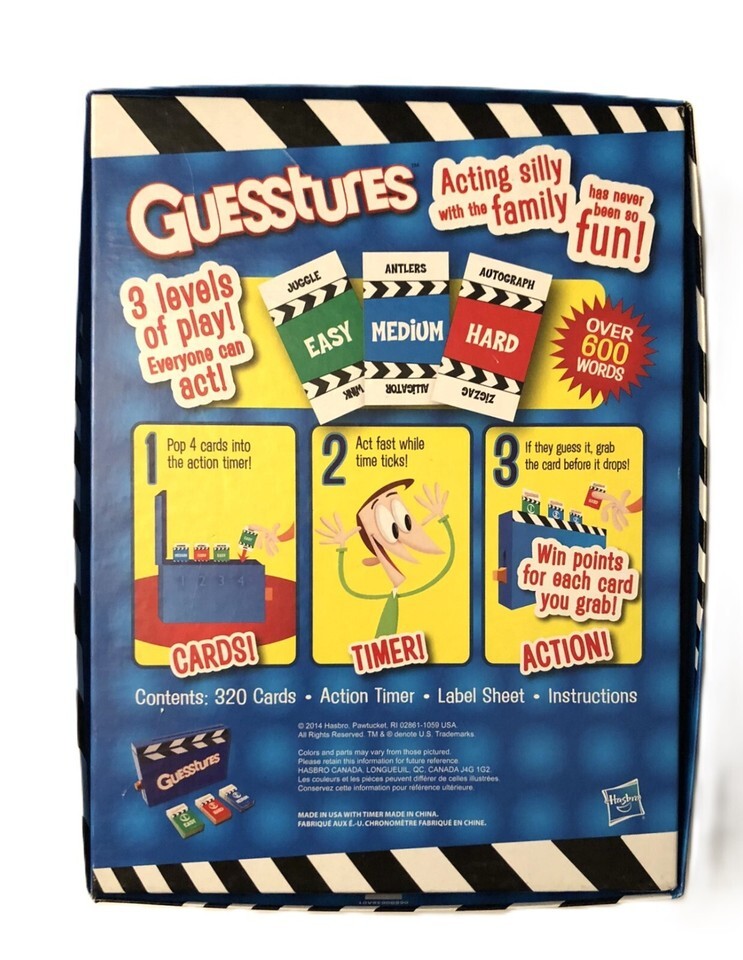 Guesstures Charades Game for 4 + Players Tested Working Read By Hasboro. The set is missing 14 medium cards, there are still 93 medium cards, 107 easy and 106 hard cards.