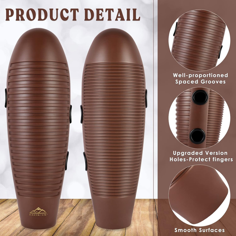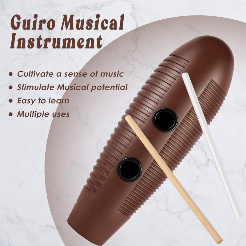 Easy to Use: There are two holes on one side of the guiro. You only need to hold it with two fingers and hold the stick with the other hand. When you rub or knock on the surface of the guiro,it can make a different sound