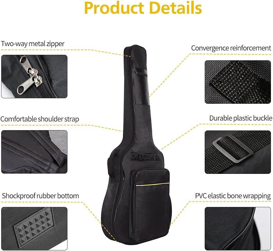 ?Package Include?- Package includes 3 pack guitar bags. The guitar bag is the best choice for protecting and transporting musical instruments. It is for guitar lovers the best gift. ?Package Include?- Package includes 3 pack guitar bags. The guitar bag is the best choice for protecting and transporting musical instruments. It is for guitar lovers the best gift. ?Large Space?- Guitar bag can hold 38/40/41 inch guitars. Its length is 41.7in, the neck width is 5.3in, and the thickness is 4.9in. The guitar gig bag has 2 outer pockets. The large size is used to store accessories (pedals, adapters, cables, etc.). The top pocket is used to store tuners, plectrums and so on. ?Large Space?- Guitar bag can hold 38/40/41 inch guitars. Its length is 41.7in, the neck width is 5.3in, and the thickness is 4.9in. The guitar gig bag has 2 outer pockets. The large size is used to store accessories (pedals, adapters, cables, etc.). The top pocket is used to store tuners, plectrums and so on. ?Safe Protection?- The guitar case has a durable rubber base and thick sponge, which can protect the guitar from accidental impact during transportation. The two-way metal zipper is strong and smooth, not easy to jam or break, to prevent scratching the guitar. ?Safe Protection?- The guitar case has a durable rubber base and thick sponge, which can protect the guitar from accidental impact during transportation. The two-way metal zipper is strong and smooth, not easy to jam or break, to prevent scratching the guitar. ?Sturdy and Durable?- The guitar bag is made of Oxford waterproof fabric, which has high density and scratch resistance. It has shock-absorbing and compressive sponge inside, PVC elastic plastic bone edging, and reinforced stitching at the joints such as straps and handles, which are comfortable and durable. ?Sturdy and Durable?- The guitar bag is made of Oxford waterproof fabric, which has high density and scratch resistance. It has shock-absorbing and compressive sponge inside, PVC elastic plastic bone edging, and reinforced stitching at the joints such as straps and handles, which are comfortable and durable. ?Easy to Carry?- The acoustic guitar performance bag comes with two adjustable backpack straps and 2 handle loop. You can carry it with your hands or wear it on your shoulder. The strap contains cushioning sponge to reduce the pressure on the shoulders. ?Easy to Carry?- The acoustic guitar performance bag comes with two adjustable backpack straps and 2 handle loop. You can carry it with your hands or wear it on your shoulder. The strap contains cushioning sponge to reduce the pressure on the shoulders.