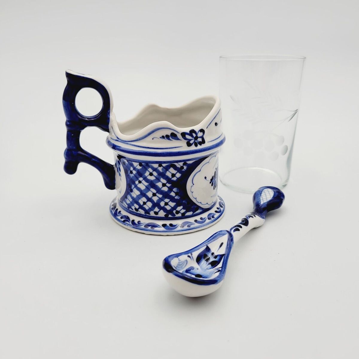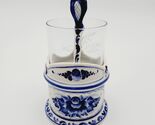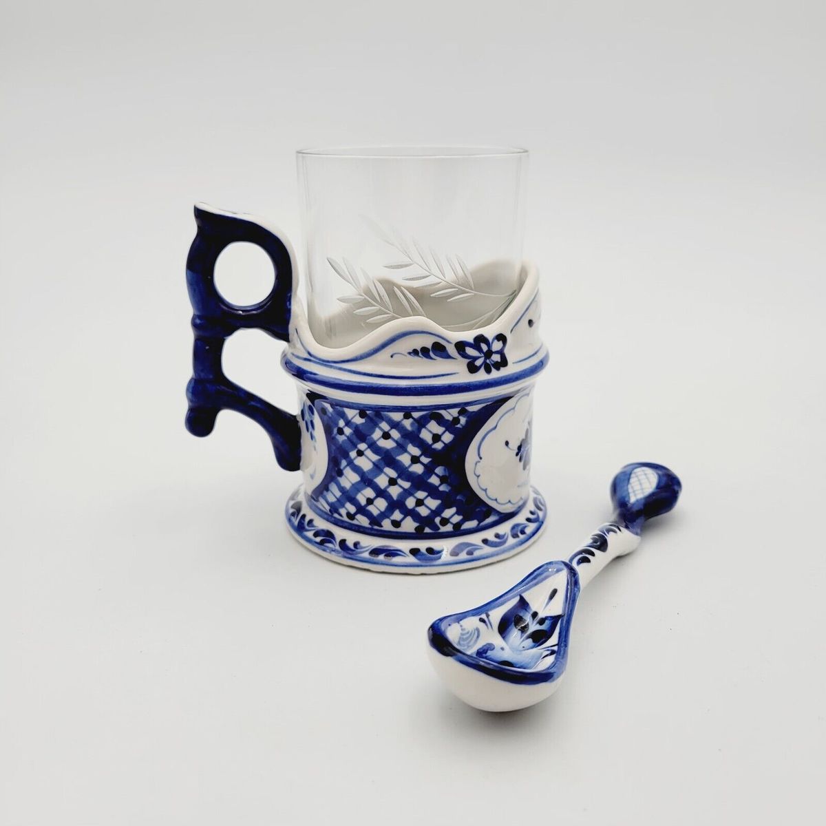 - Gzhel Cup Glass Holder crystal lead glass tea spoon set Signed