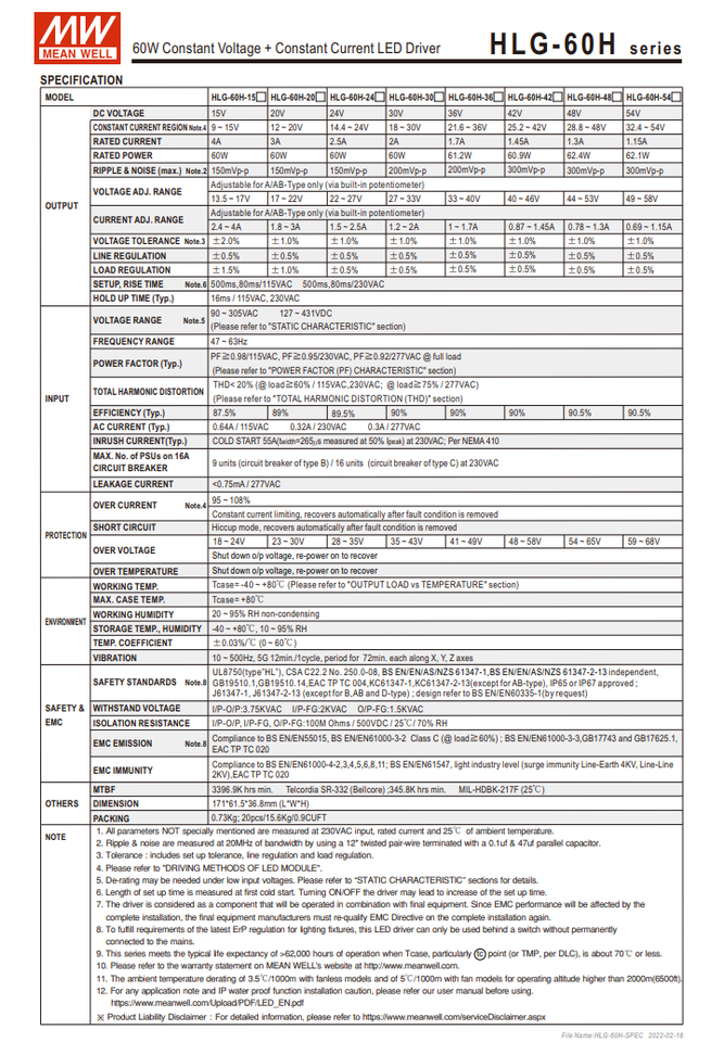 - HLG-60H-36B Mean Well LED Driver 36V Power Supply 60W 1.7A IP67 AC-DC W/ Dimming
