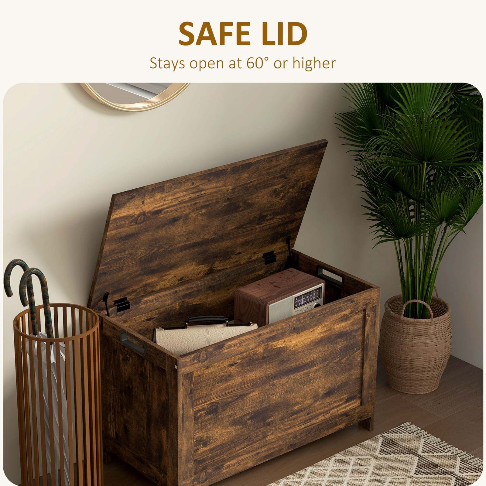 Enhanced Safety with 2 Hinges: Equipped with two alloy steel hinges, the lid of this wood chest remains securely open at 60 or higher, eliminating the risk of slamming shut or pinched fingers.