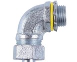 Suitable for indoor or outdoor locations to connect flexible metallic liquid tight conduit to a steel outlet box or other metal enclosure or hub. Feature split gland ring that assures a liquid tight seal. These feature a 90 connection and have an insulated throat.