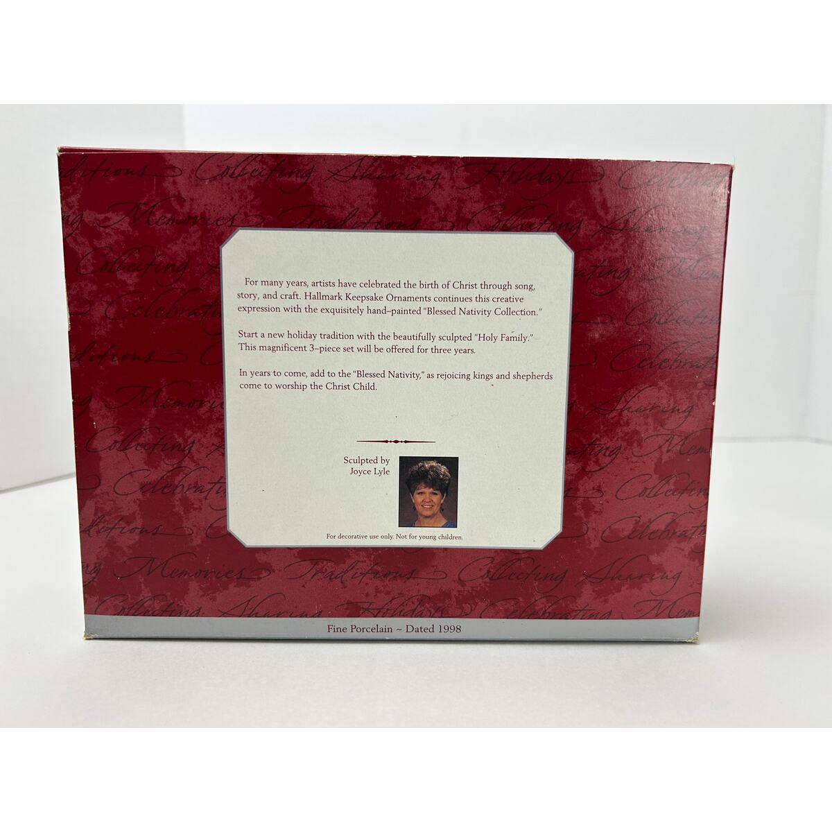 Porcelain Hallmark Keepsake 3-piece ornament set from 1998, first in the Blessed Nativity Collection by sculptor Joyce Lyle. Includes Mary, Joseph, and Baby Jesus, each finely detailed and hand-painted. Original box and plastic tray included, with light shelf wear consistent with age.