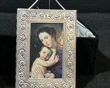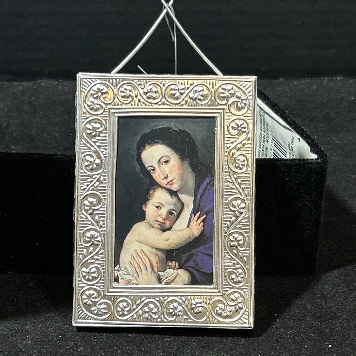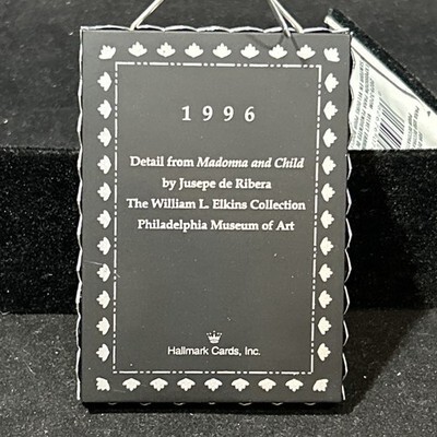 The product is a vintage Hallmark ornament from 1996, featuring Madonna and Child, designed by Linda Sickman. This multi-colored ornament is part of the Philadelphia Museum of Art franchise and depicts the Madonna and Child by Jusepe de Ribera. The ornament comes in its original box, which is damaged. See photos for details. With a compact size of 3.5 inches in height and 2.5 inches in length, this painted ornament is a collectible item suitable for your tree or your wall.