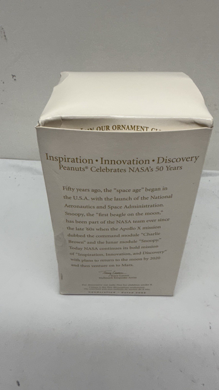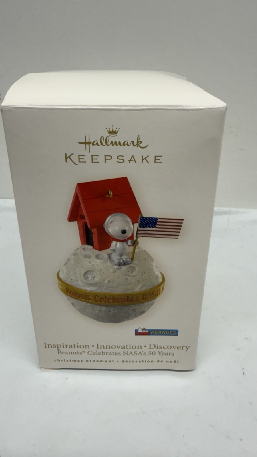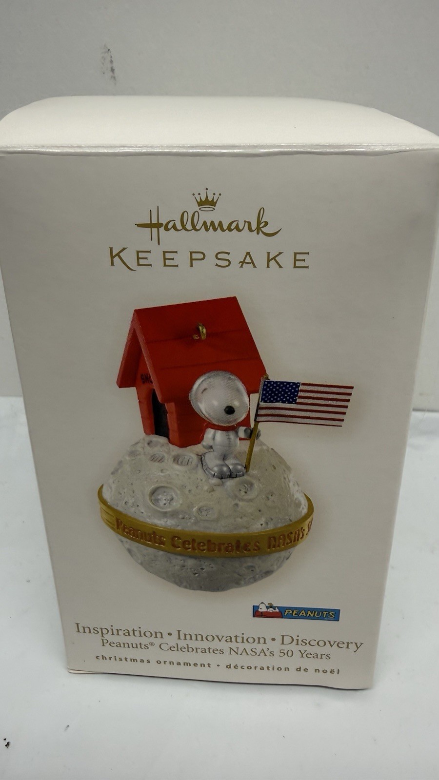 The box has some dents but the ornament is perfect. The product is a 2008 Hallmark Peanuts Snoopy ornament celebrating the 50th anniversary of NASA. Made of porcelain, this collectible ornament features Snoopy as a space astronaut, with its original box included. As part of the Peanuts franchise, this unique ornament captures the humor and charm of the beloved cartoon characters, making it an ideal addition for any collector or fan of nostalgic holiday decorations.