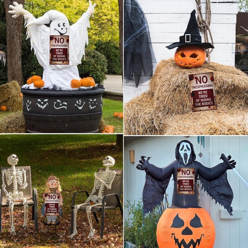 High Quality: No trespassing signs funny feature durable rust free aluminum; waterproof dust proof and fade resistant UV printing; suitable for indoor and outdoor Halloween home decor