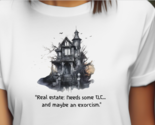 Get spooky laughs with this Halloween Haunted House T-Shirt, featuring a creepy haunted house and the funny phrase ?Real estate: needs some TLC? and maybe an exorcism.? Perfect for Halloween parties, horror lovers, or anyone with a dark sense of humor.