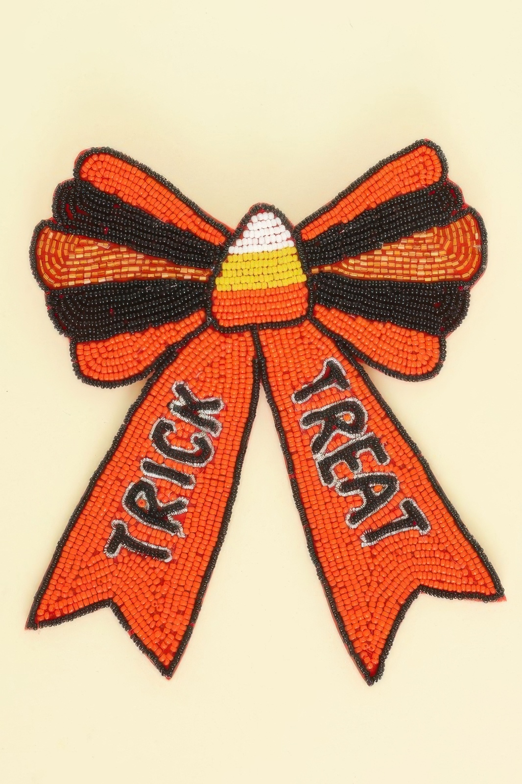 Celebrate spooky season with this candy corn-colored “Trick Treat” bow barrette. Featuring hand-beaded lettering in bold orange, black, and white, this ribbon clip makes a fun and festive statement. Lightweight and easy to wear, it’s designed for long-lasting comfort and hold. A great choice for themed school events, costume parties, or group Halloween outings.