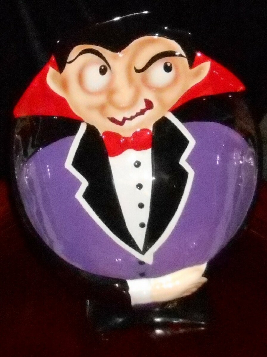 This is a great Ceramic Candy Bowl that holds 1.7 Quarts from UCP depicting Dracula. It measures approx. 10" tall x 9 1/2" across at widest points and it is in good pre-owned condition - a few very tiny glaze chips - extremely minor but noted for accuracy and are the size of a pinpoint. ***WHITE SPOTS IN PHOTOS FROM LIGHTING AND FLASH - SHOWN AT DIFFERENT ANGLES TO SEE WITH/WITHOUT WHITE SPOTS***