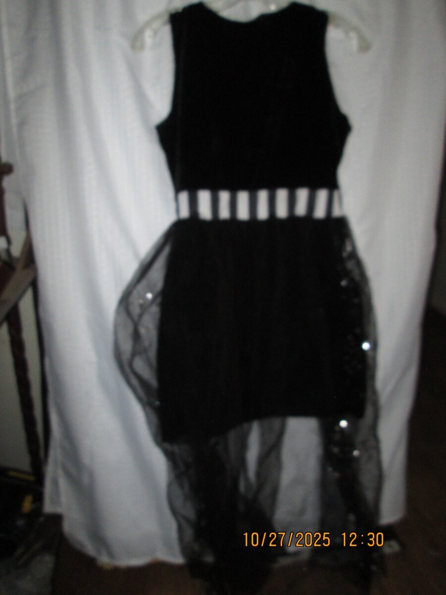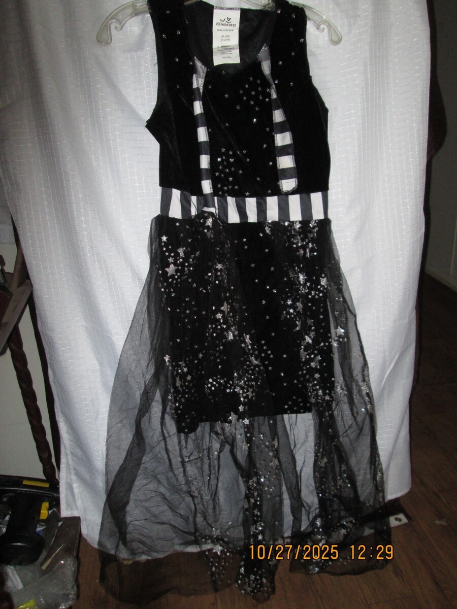 This Halloween Witch Glitter Stars Black Tulle Girls Mini Dress Hat in size XL is a festive and whimsical costume set perfect for young girls. Made of polyester with an elastic/stretch feature, the dress is comfortable to wear. The black color and Halloween theme add a spooky touch, while the glitter stars on the tulle skirt give a magical flair. The set includes a matching witch hat, making it easy to complete the costume for a fun Halloween celebration or themed party. If you have any questions, please content me. Thank you and GOD BLESS.