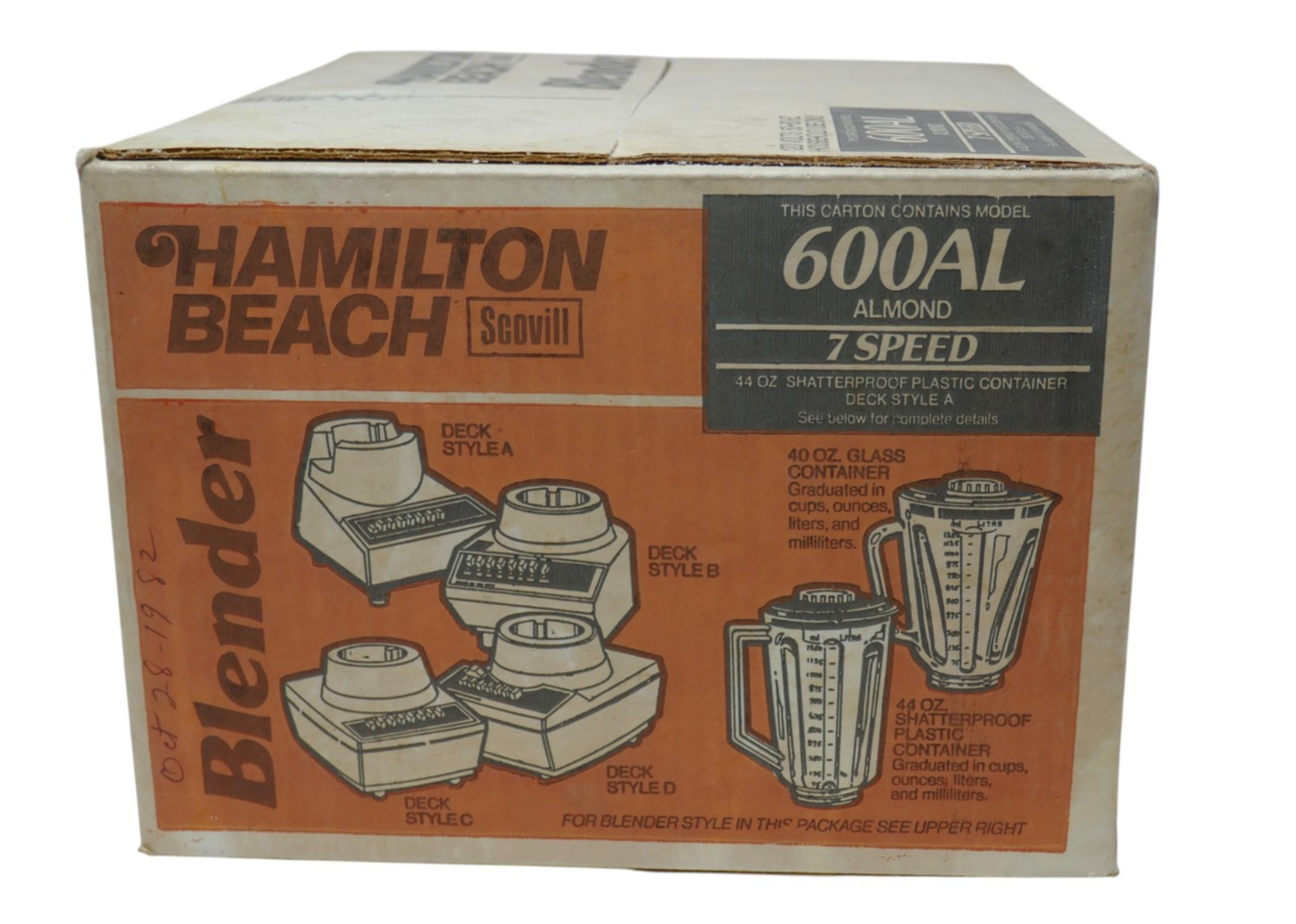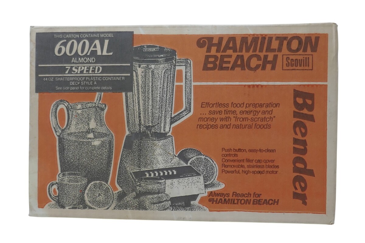 The Hamilton Beach Almond 7 Speed Blender 600AL is an electric blender in a vintage/retro style, manufactured by Hamilton Beach in the United States. The box contains a 44 oz shatterproof plastic container and Deck style A base. This blender comes in a sealed box and features 7 speeds for customizable blending options. The box does have wear from storage. Perfect for blending smoothies, soups, and sauces, this electric blender is a reliable and stylish addition to any home.