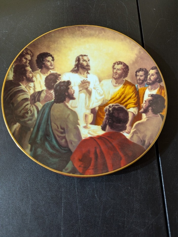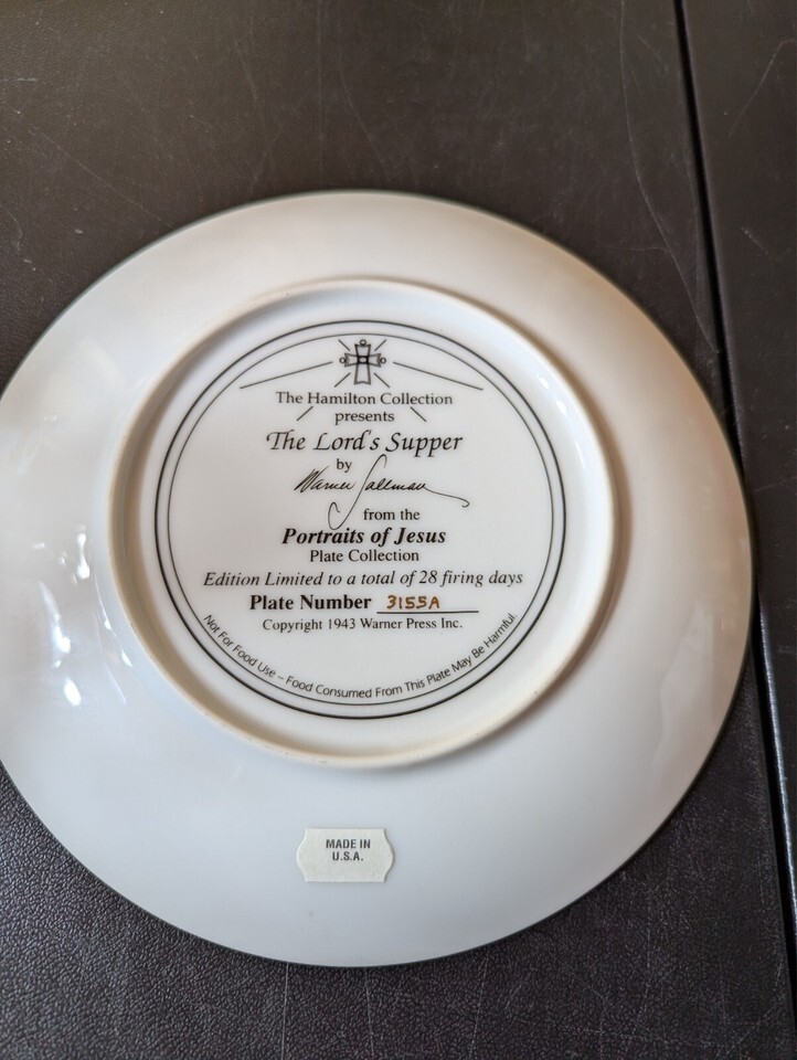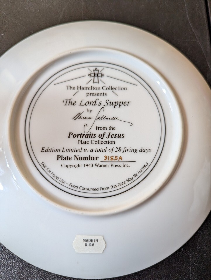 This Hamilton Collection plate from the Portraits of Jesus Collection #4500A depicts The Lord's Supper, a significant event in Christianity. Made in the United States, this collectible plate is perfect for those interested in religious memorabilia. It is not handmade and is ideal for display or as a decorative piece.