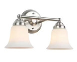 This two-light Hampton Bay vanity gives your bathroom or powder room an elegant upgrade. Boasting a sleek design and beautifully-crafted clean lines, this cottage-style vanity features a refreshing brushed nickel finish and frosted clear glass shades to offer bright light. Enjoy the polished look of this vanity for years to come. It uses two 60-Watt bulbs, which are sold separately.