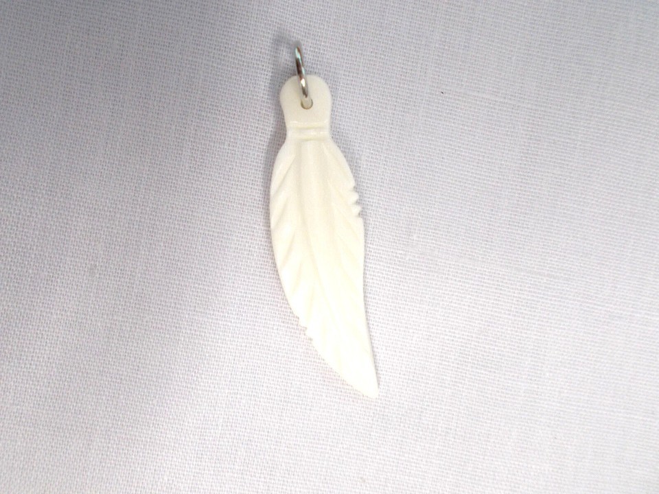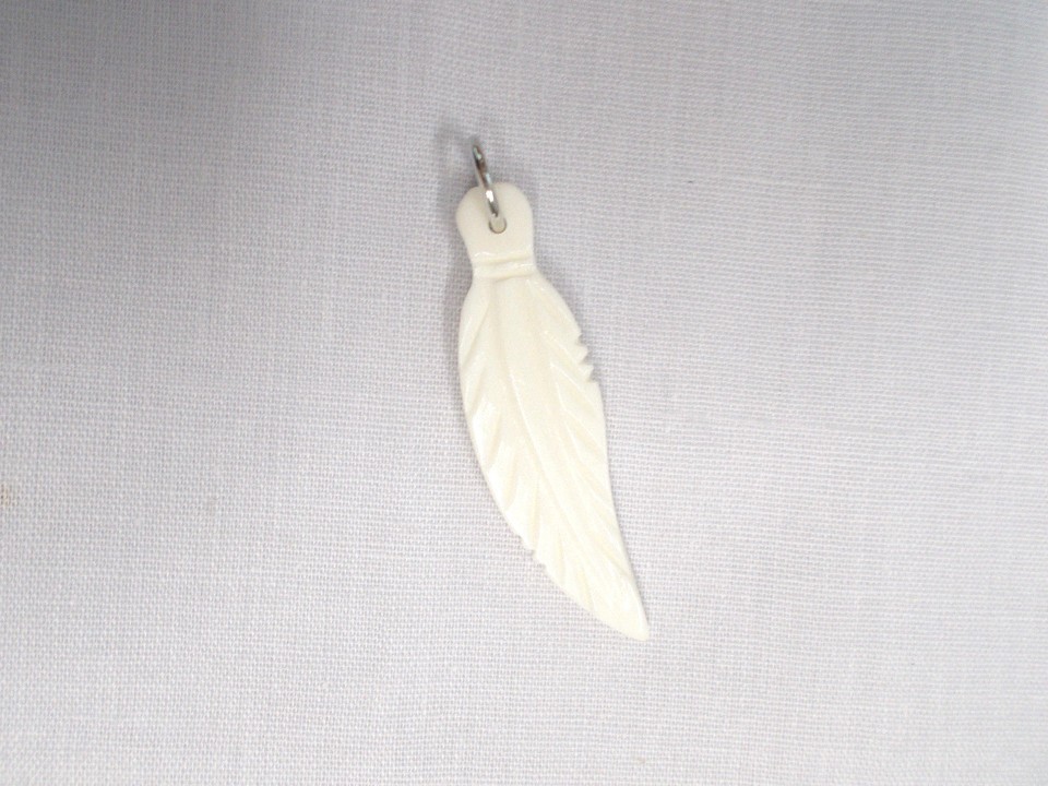 NEW HAND CARVED ELEGANT SINGLE FEATHER - IVORY WHITE COLOR - SOLID USA BUFFALO / AMERICAN BISON BONE PENDANT