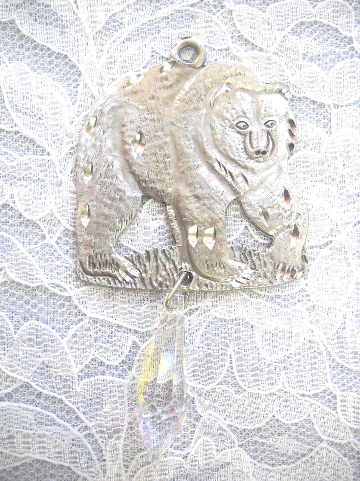 - HAND ENGRAVED PEWTER GRIZZLY BEAR & LARGE PRISM CRYSTAL ORNAMENT / SUNCATCHER