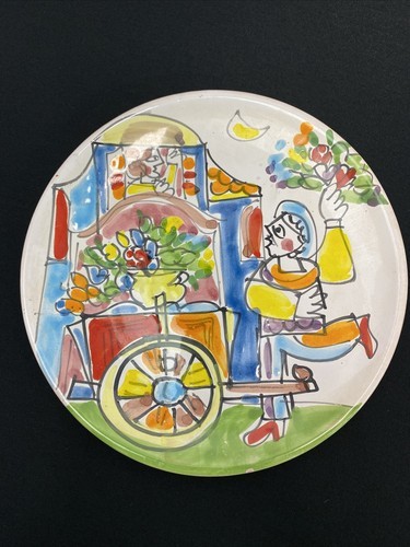 - Hand Painted Collectible Pottery Flower Cart Plate Multicolored 8"