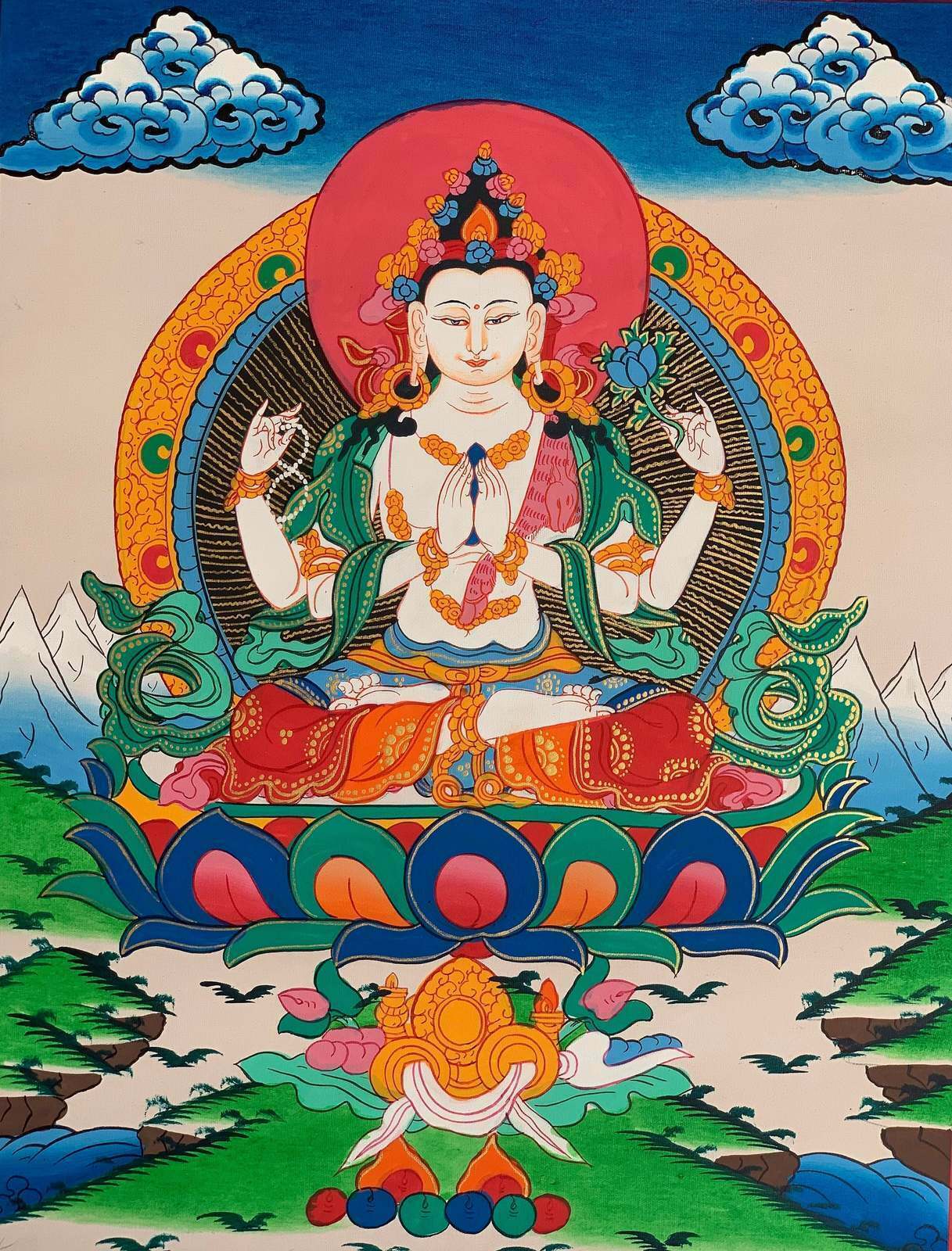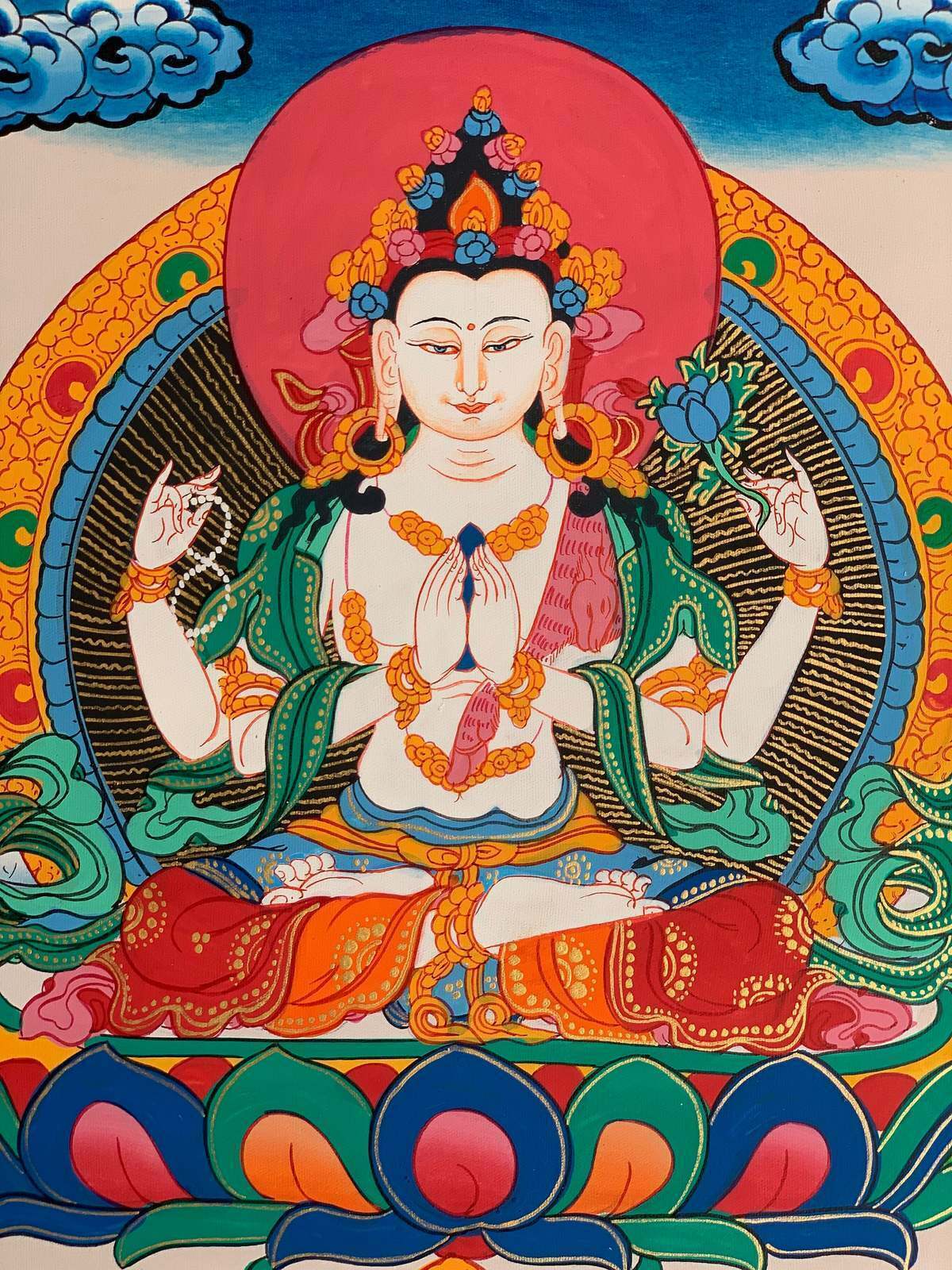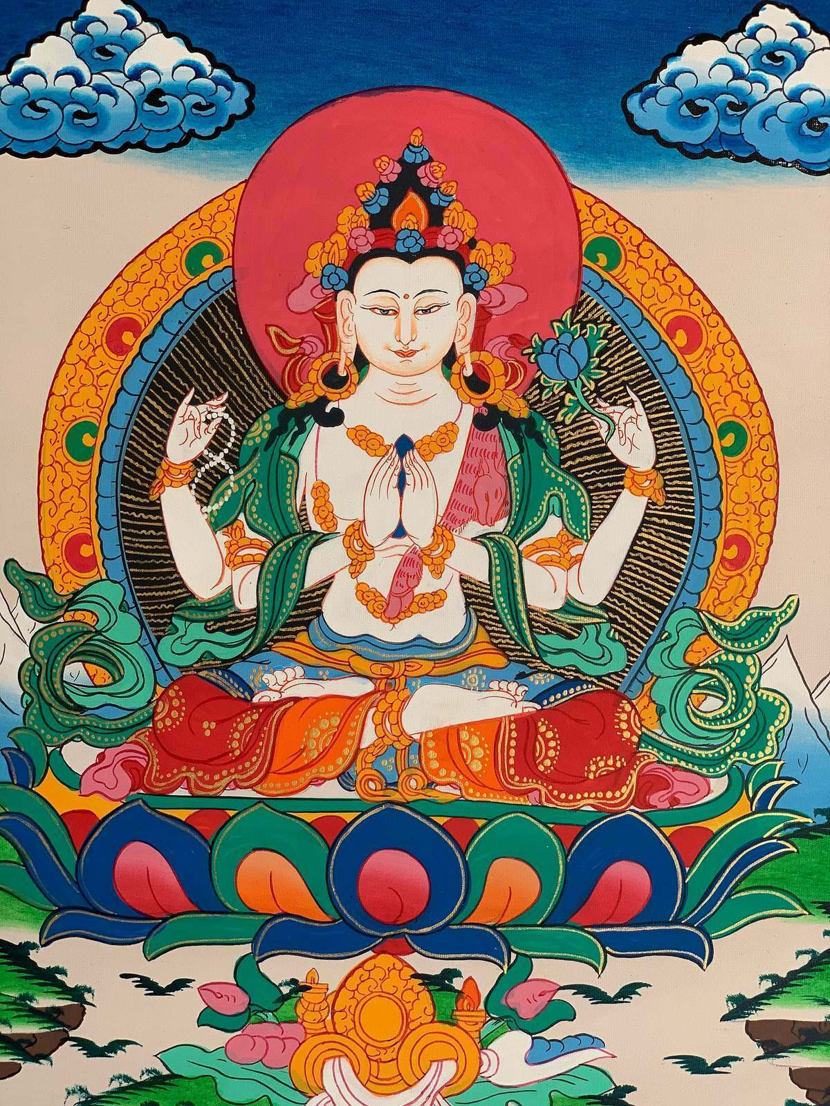 Hand-painted Avalokitesvara Tibetan Thangka Art, Painting on Canvas, 12 x 15-Inc
