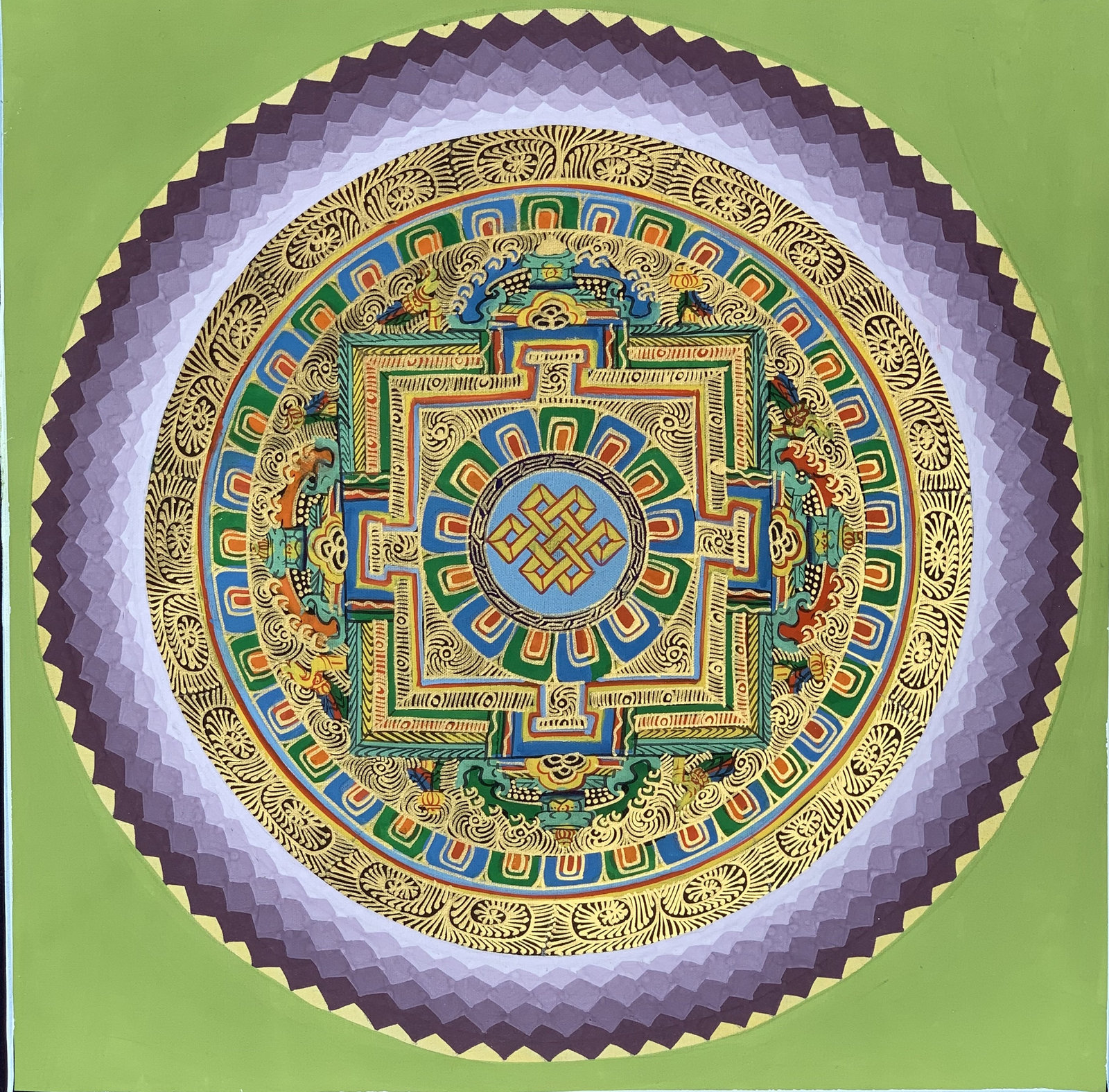 These are beautiful Mantra and auspicious sign Mandala Thangka for making a gift to your dear ones or hanging on your home, office wall. These are original Tibetan thangka paintings with the Mantra Mandala theme. The sacred mantra is Om and Mani Padme Hum, in this Thangka.