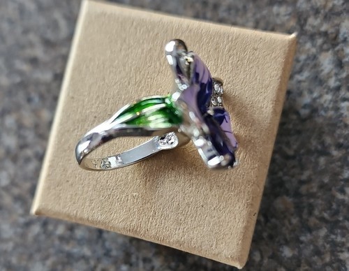 Two-tone purple flower with green leaf design on sides of ring