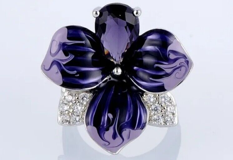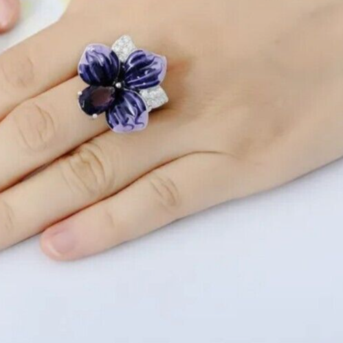 - Handcrafted ~ Amethyst ~ Flower Ring w/Gemstones ~ 925 Silver Plated ~ Size 5