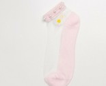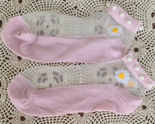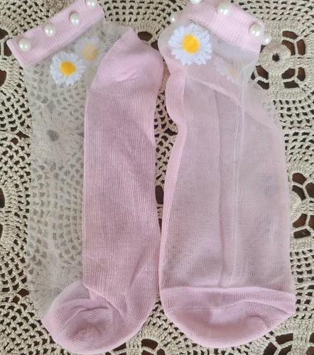 - Handcrafted ~ Pink ~ Embellished w/Pearls ~ Embroidered Daisy ~ Ankle Socks