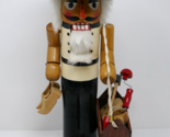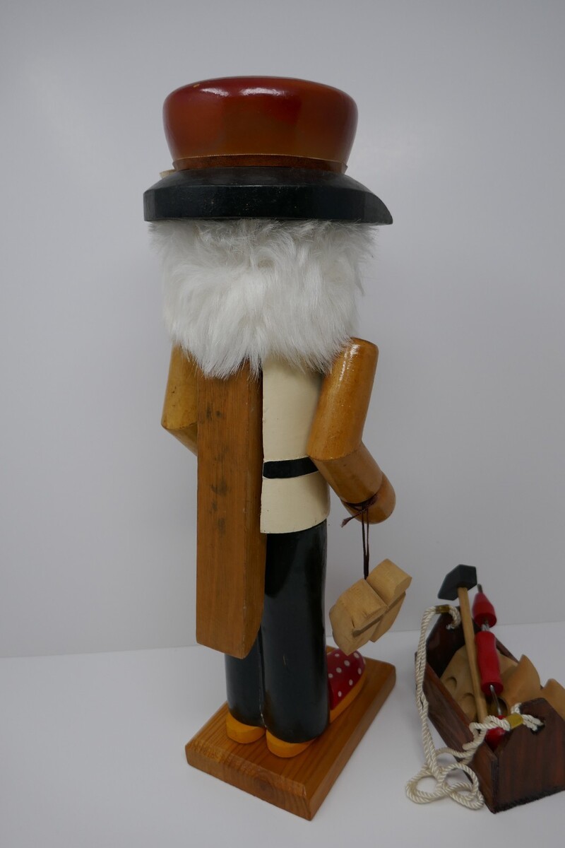This handcrafted reproduction of the Steinbach Cobbler Nutcracker is a 15 inch, multicolor wooden nutcracker featuring an irregular shape. He has minimal wear in areas. Made with intricate details and a handmade finish, this reproduction is sure to delight collectors and holiday enthusiasts alike.