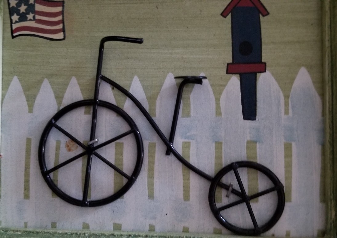 Theme of picture is a metal unicycle leaning on a picket fence with a flag flying overhead a birdhouse
