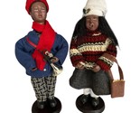 Celebrate the holiday season with this charming pair of African American caroler dolls, each standing approximately 9 inches tall. The boy is dressed in a red hat and scarf with a blue coat and plaid pants, holding a miniature trumpet. The girl wears a cozy striped knit sweater, gray skirt, and white hat, with a felt purse on her arm. Both are mounted on round wooden bases and feature expressive, open-mouth singing poses.
