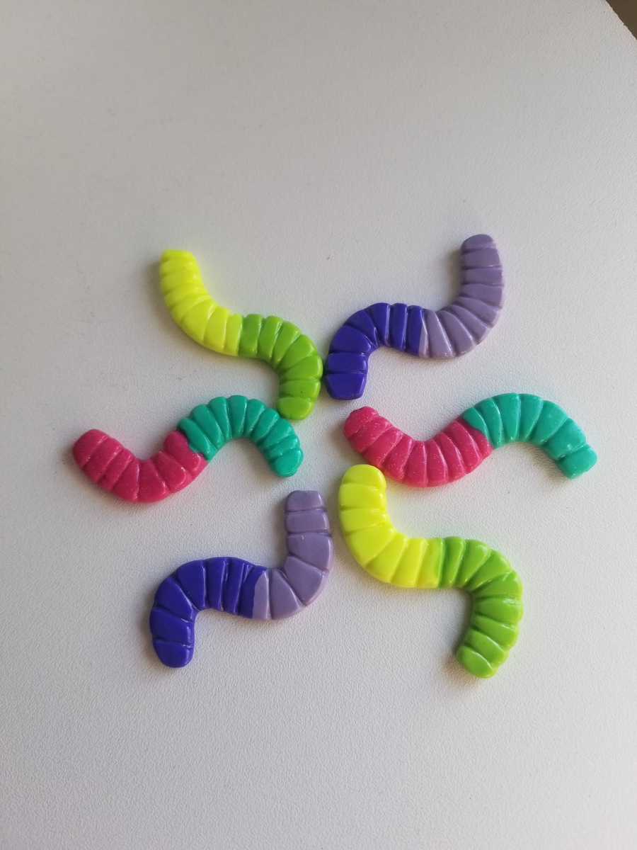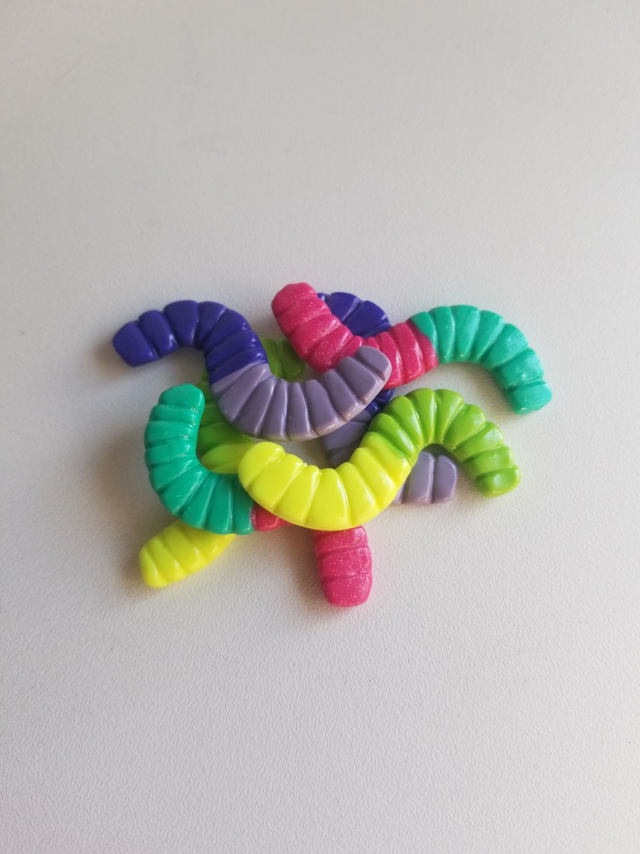 Handmade Clay Gummy Worms Magnet in 3 color variations including: lilac/purple, green/yellow, and teal/sparkly pink. Magnets used are Neodynium 10x2mm magnets. Clay is glazed with a satin glaze.