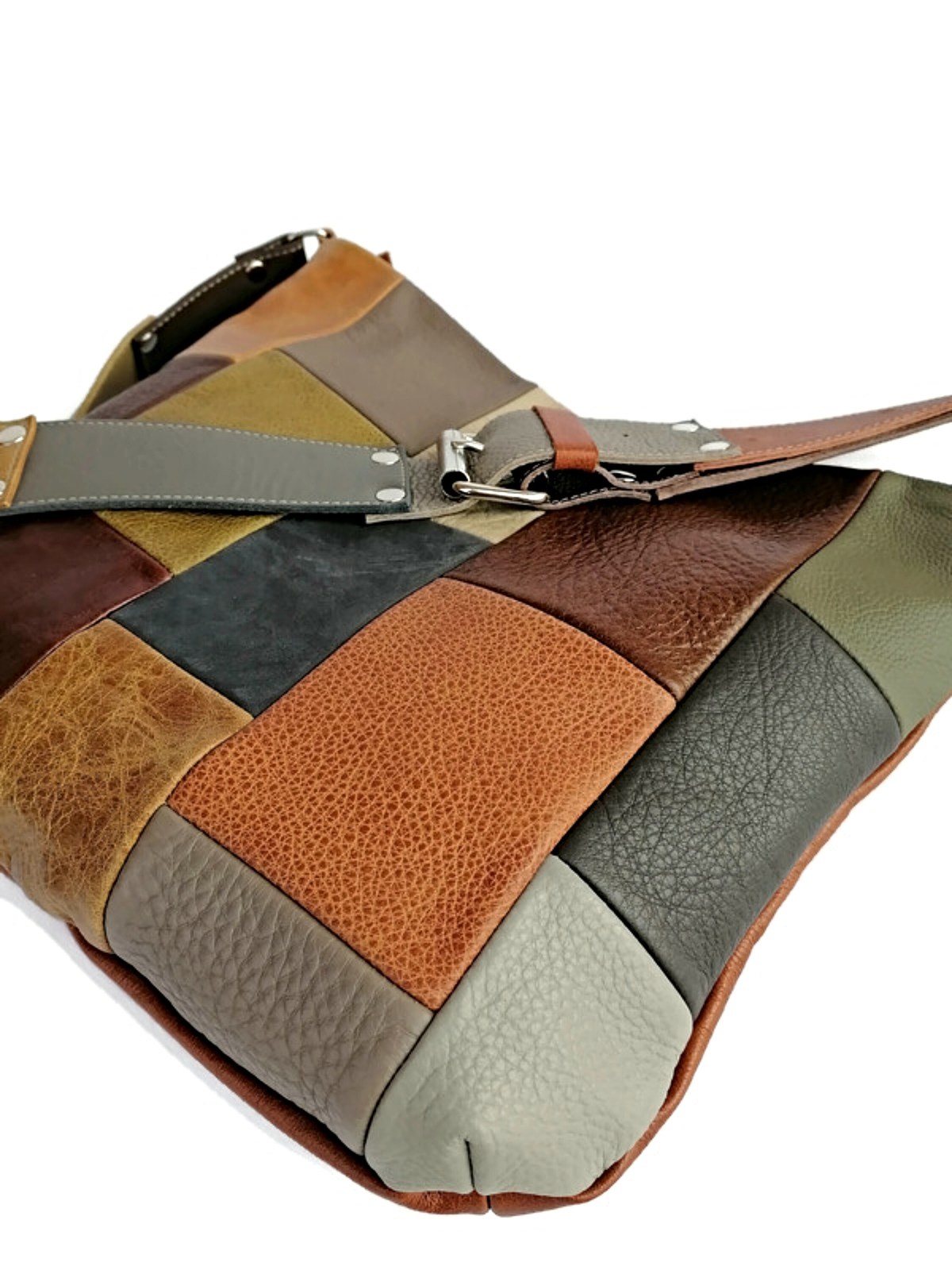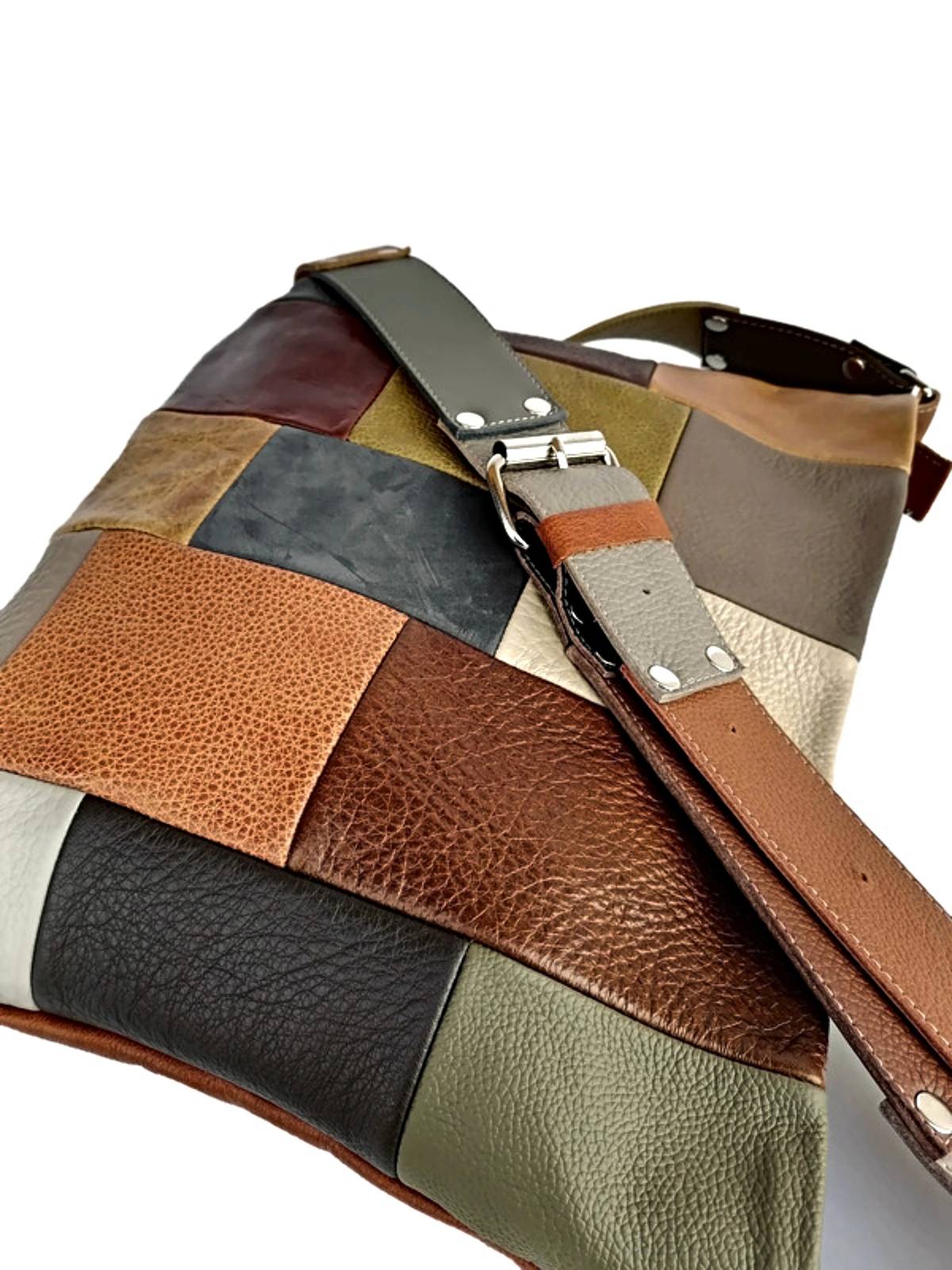 - Handmade Leather Patchwork Crossbody Bag: Earth Tone Shoulder Bag