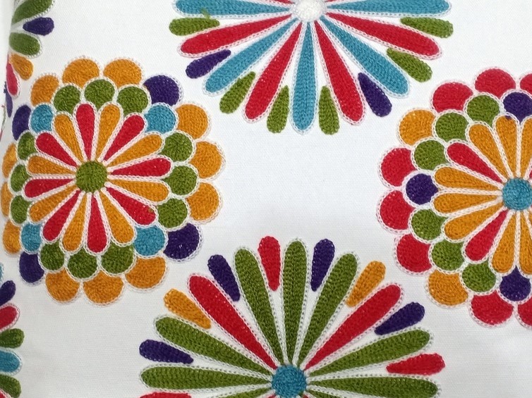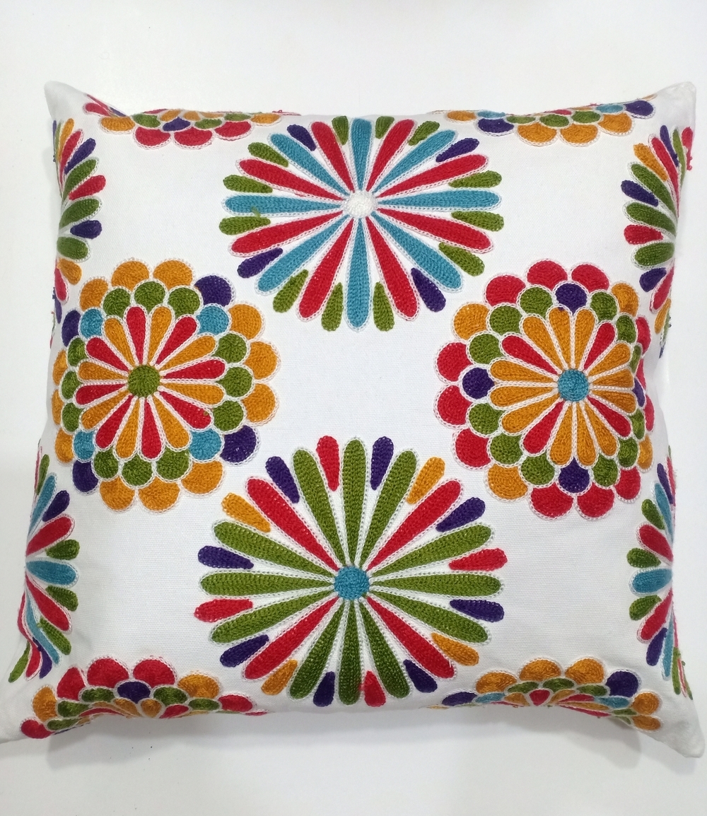 Add a vibrant splash of Moroccan charm to your living space with this beautifully embroidered throw pillow. Handcrafted with care, the design features multicolored floral mandalas intricately stitched on a white cotton background. Perfect for boho, eclectic, or modern interiors, this eye-catching cushion brings warmth, color, and artisanal flair to your sofa, bed, or reading nook.