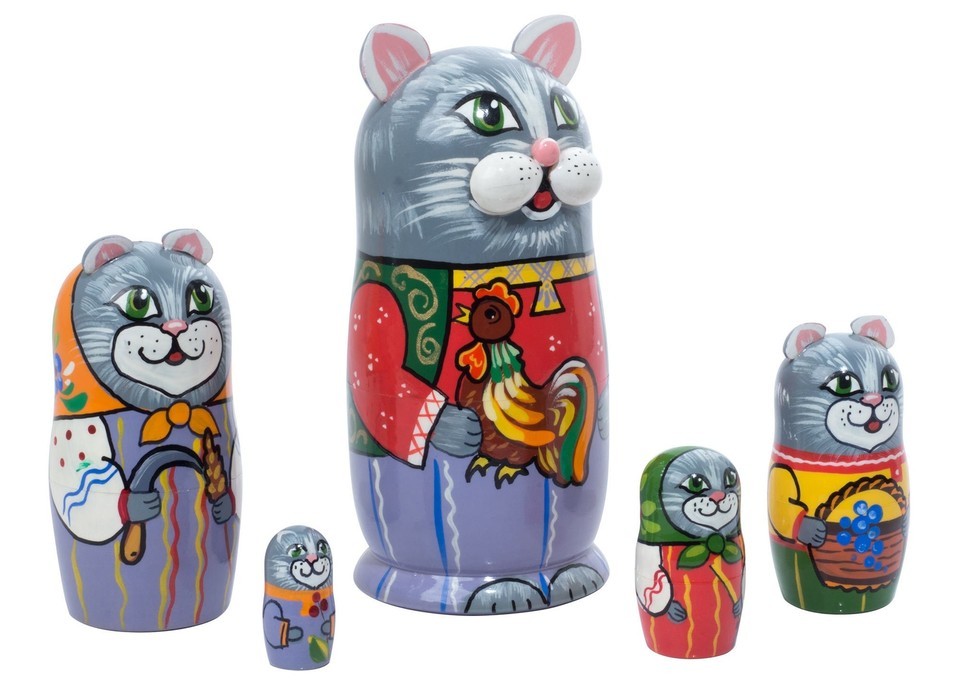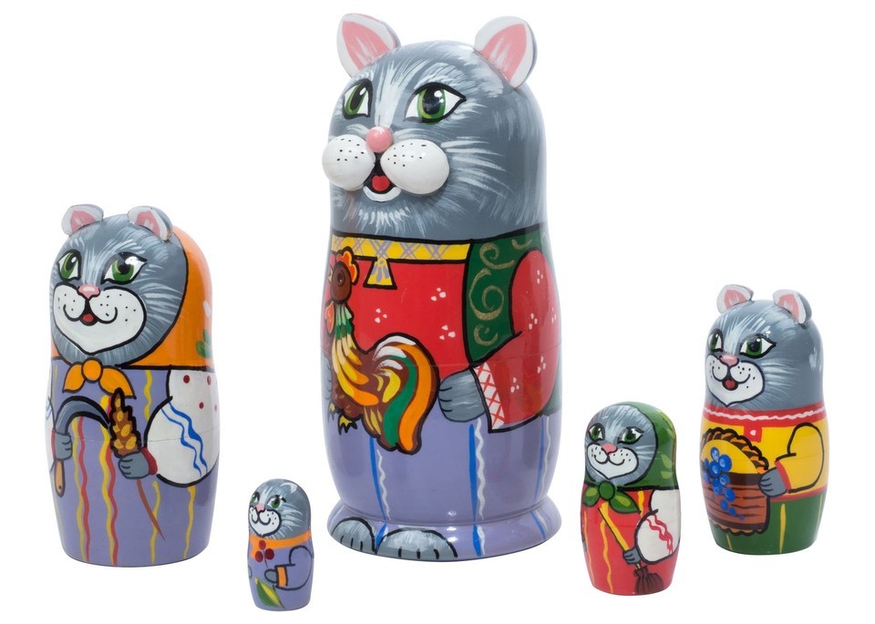 Here is a family of cats wearing feline smiles for your delight. Daddy cat carries a rooster like a good peasant farmer, and the rest of the family is dressed in colorful peasant clothes and holds articles of the countryside. The top three cats have 3-D ears attached, making it a clever nesting doll. This pussycat family will win every cat lover's heart! It's actually a feline version of the Rooster Girl--the original Russian stacking doll?see our Peasant Matriarch Doll for comparison, and own both. Another Golden Cockerel original.