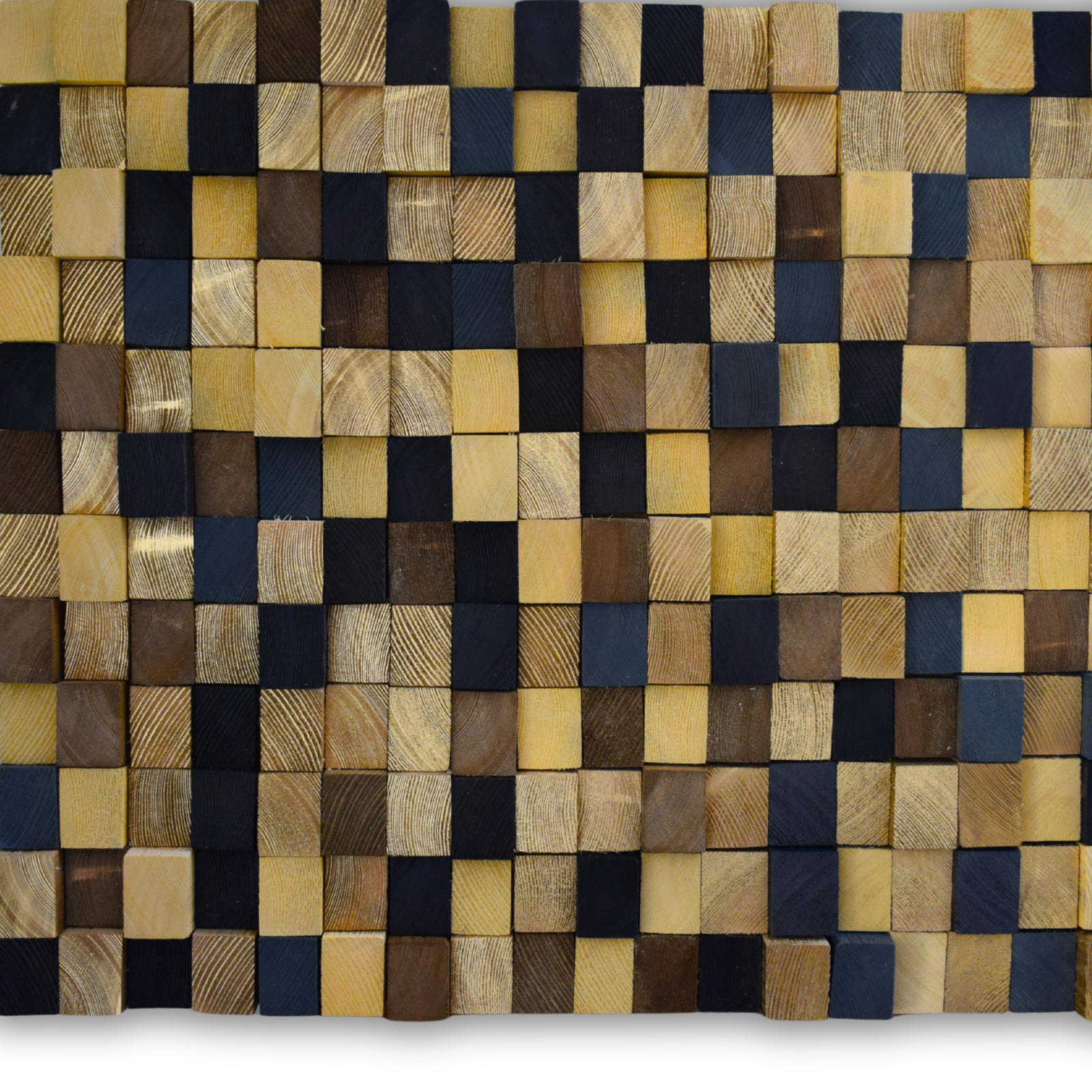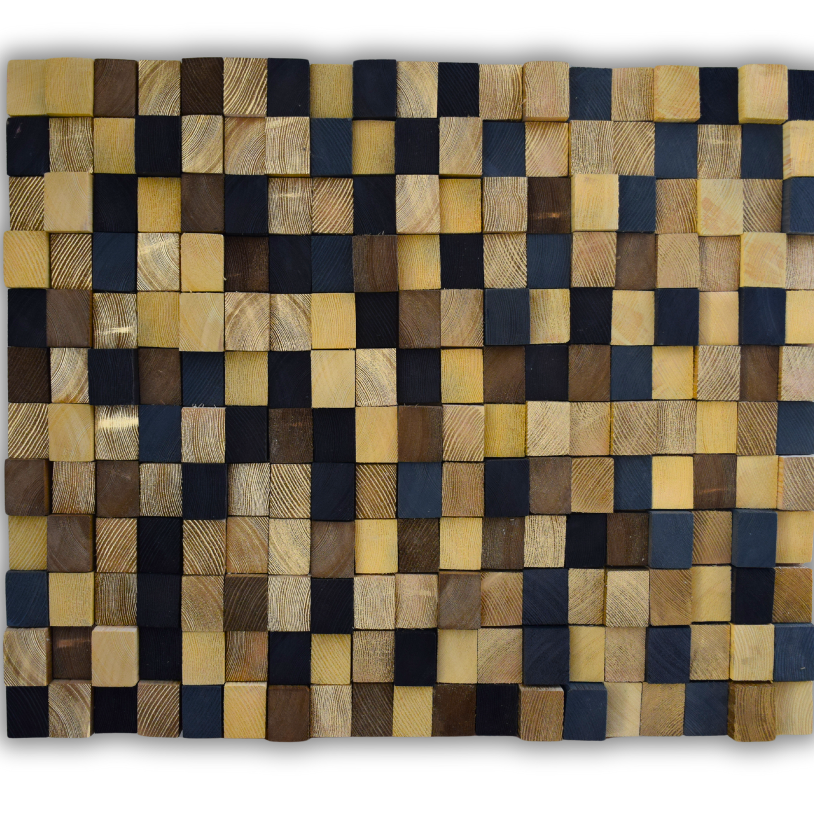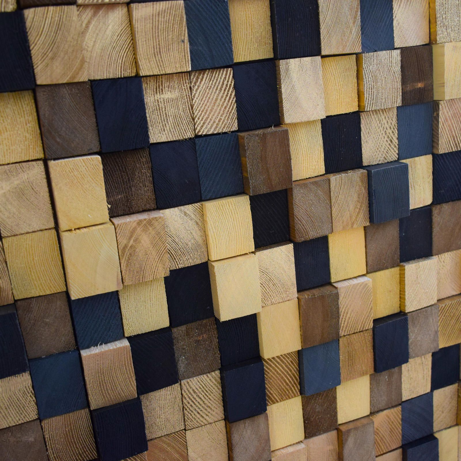 Transform your space with this handmade reclaimed wood wall mosaic, crafted from carefully selected recycled wooden blocks. Each block is cut and hand-painted, giving the mosaic a unique character – no two pieces are identical.