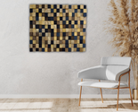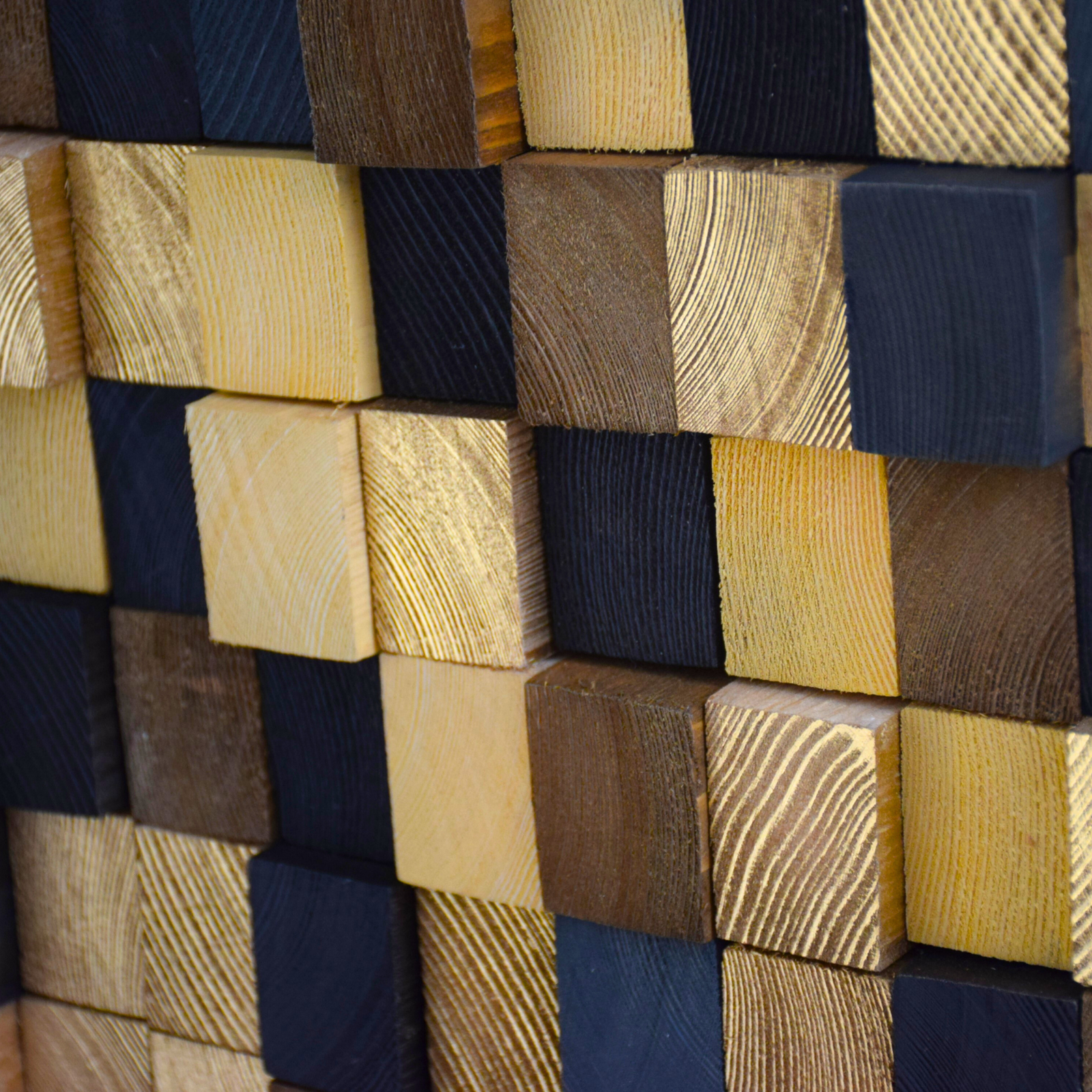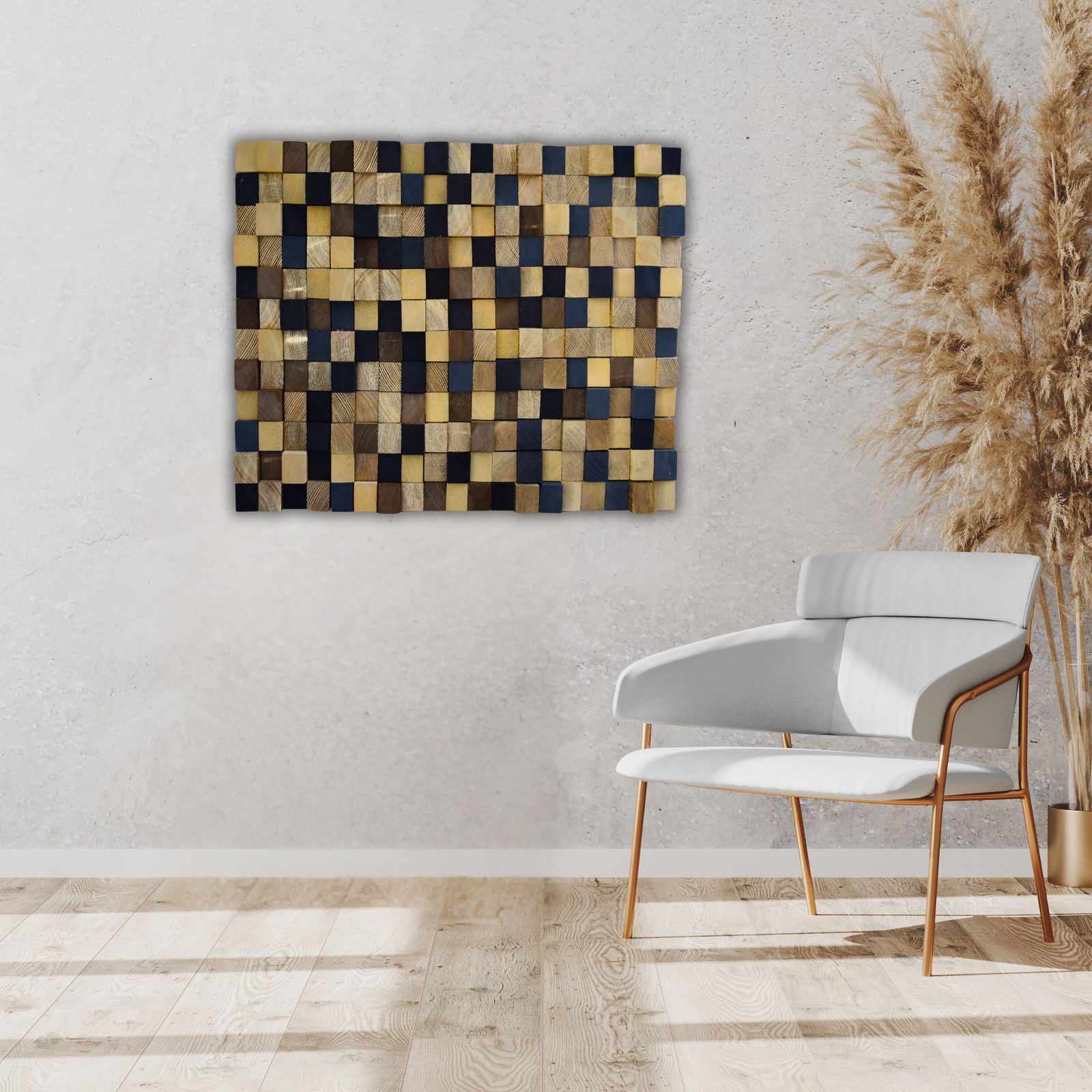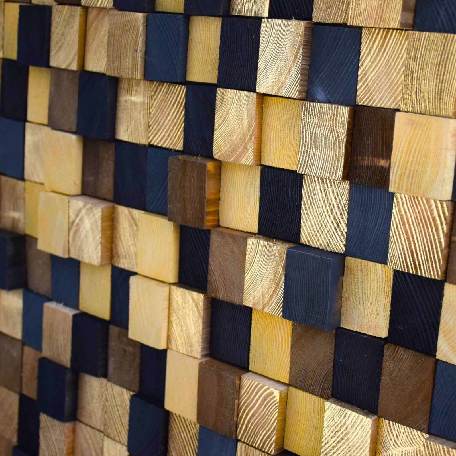 Transform your space with this handmade reclaimed wood wall mosaic, crafted from carefully selected recycled wooden blocks. Each block is cut and hand-painted, giving the mosaic a unique character – no two pieces are identical.
