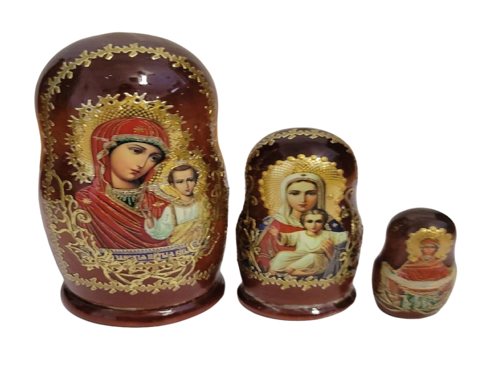 This product is a set of handmade Russian nesting dolls, also known as Matryoshka dolls, featuring Orthodox icons of religious figures such as St. Nicholas. The dolls are crafted in the Russian Federation and are inspired by Christian beliefs. Each doll is intricately designed, with a focus on depicting scenes and symbols of the Christian faith. This unique collectible set would be a meaningful addition to any religious or spiritual collector's display, showcasing the rich religious history and traditions of Russia. Size the biggest doll is 7 inches tall and as each doll is opened each doll gets smaller down to the last doll. This set opens from the bottom of each doll which is different from most nesting dolls that open from the middle. Any patches in the photos are from the camera's lig