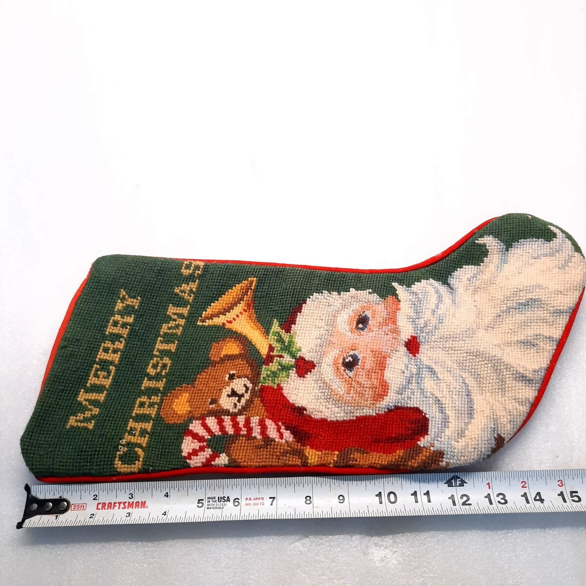 - Handmade Stocking Merry Christmas Santa Needlepoint embroidery green teddy bear