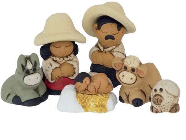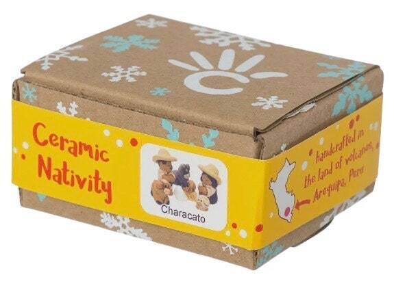 This ceramic Nativity design reflects the region of Characato, Peru and has 9 pieces - Joseph Mary (with hats), Baby Jesus, manger and 3 cute witnesses. Feel good decorating this Christmas with decor that gives back to the hands that made them! Size: 1.25"H handmade and ready to give presents with gift box included