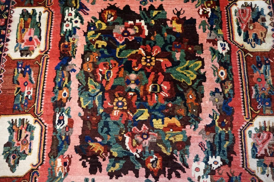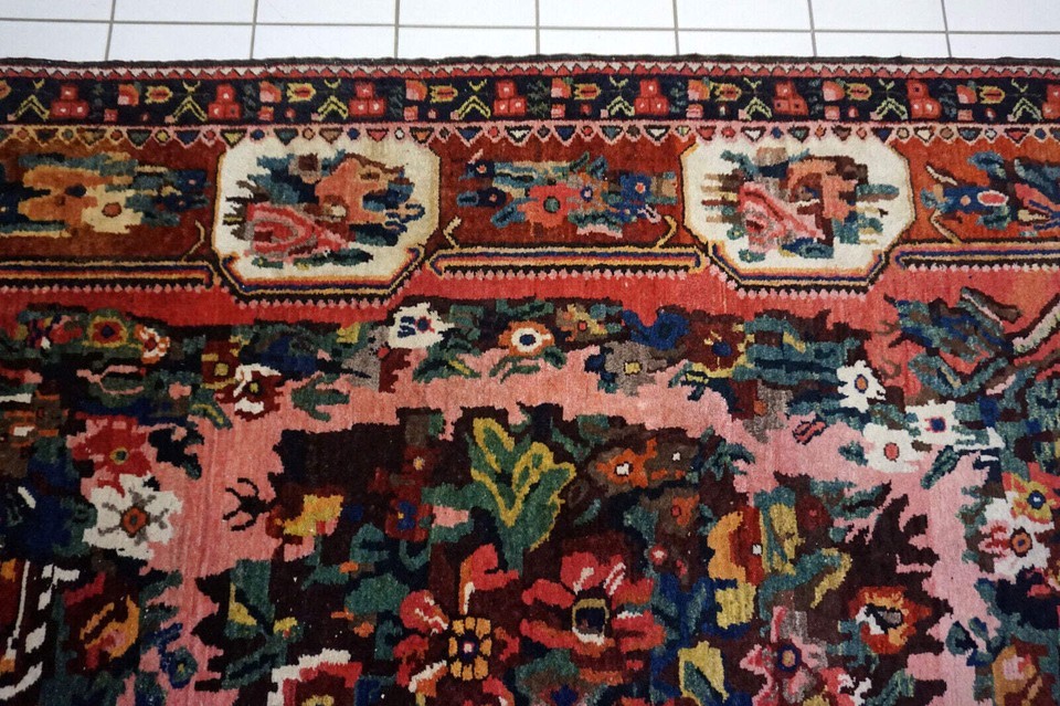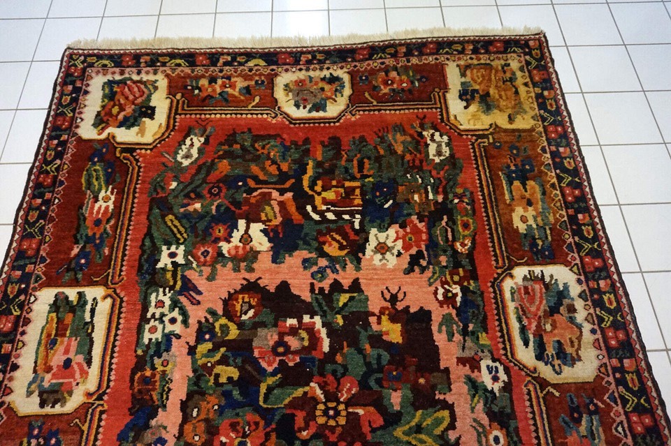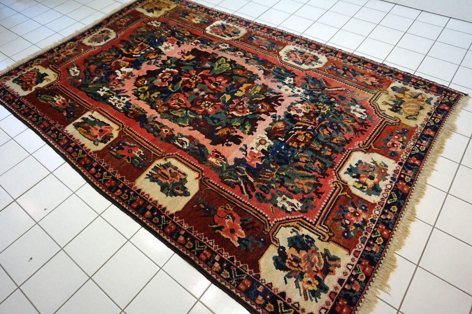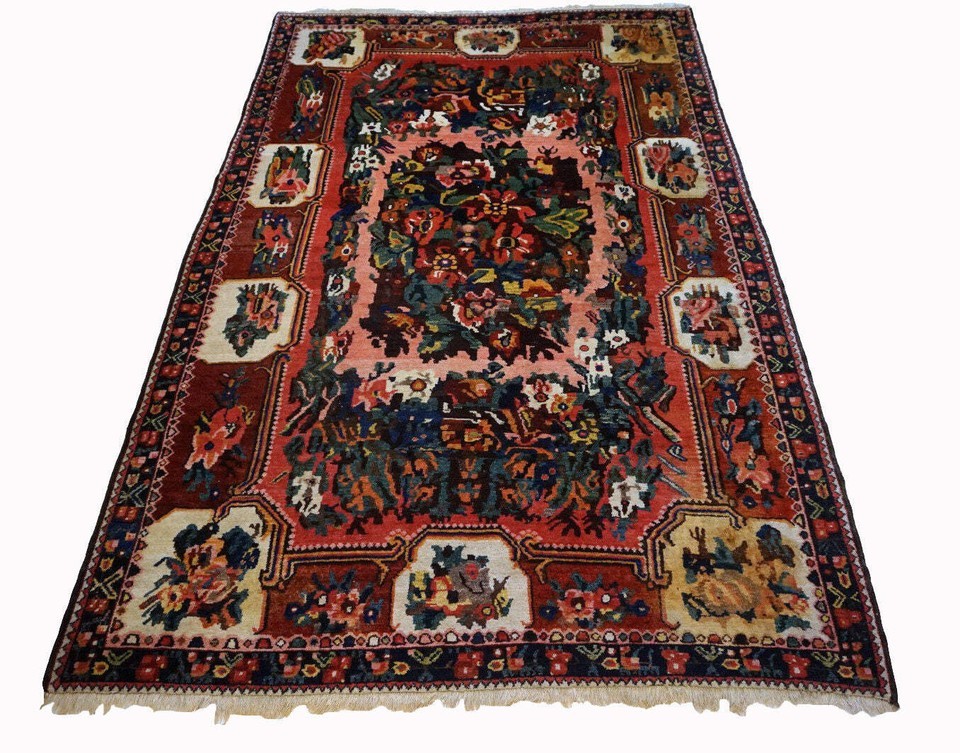 Introducing our Handmade vintage Persian Bakhtiari rug from the 1970s. This beautiful rug is crafted from premium quality wool, making it durable and long-lasting. The rug is in original good condition, with no signs of wear or tear. Measuring at 5.5' x 8.3' (169cm x 253cm), this rug is the perfect size to add a touch of elegance and sophistication to any room. Its Middle Eastern origin and Bakhtiari style add to its unique charm and authenticity. The rug's background colors include red, beige, green, rose, burgundy, and blue, making it a vibrant and colorful addition to your home. Its busy garden design features an abundance of flowers, adding a touch of nature to your living space. This handmade vintage Persian Bakhtiari rug is a true masterpiece, with its intricate design and premium quality wool. It is perfect for adding warmth and texture to any room and is sure to be a conversation starter. -condition: original good, -circa: 1970s, -size: 5.5' x 8.3' (169cm x 253cm), -material: wool, -country of origin: Middle East, -style: Bakhtiari, -background colors: red, beige, green, rose, burgundy, blue.