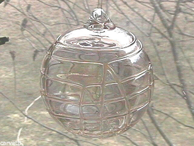 This item is one approximately 4" Diameter Round Pale Peachy Pink Glass with Geometric Lines with Slight Ab Finish Hanging Glass Ball.